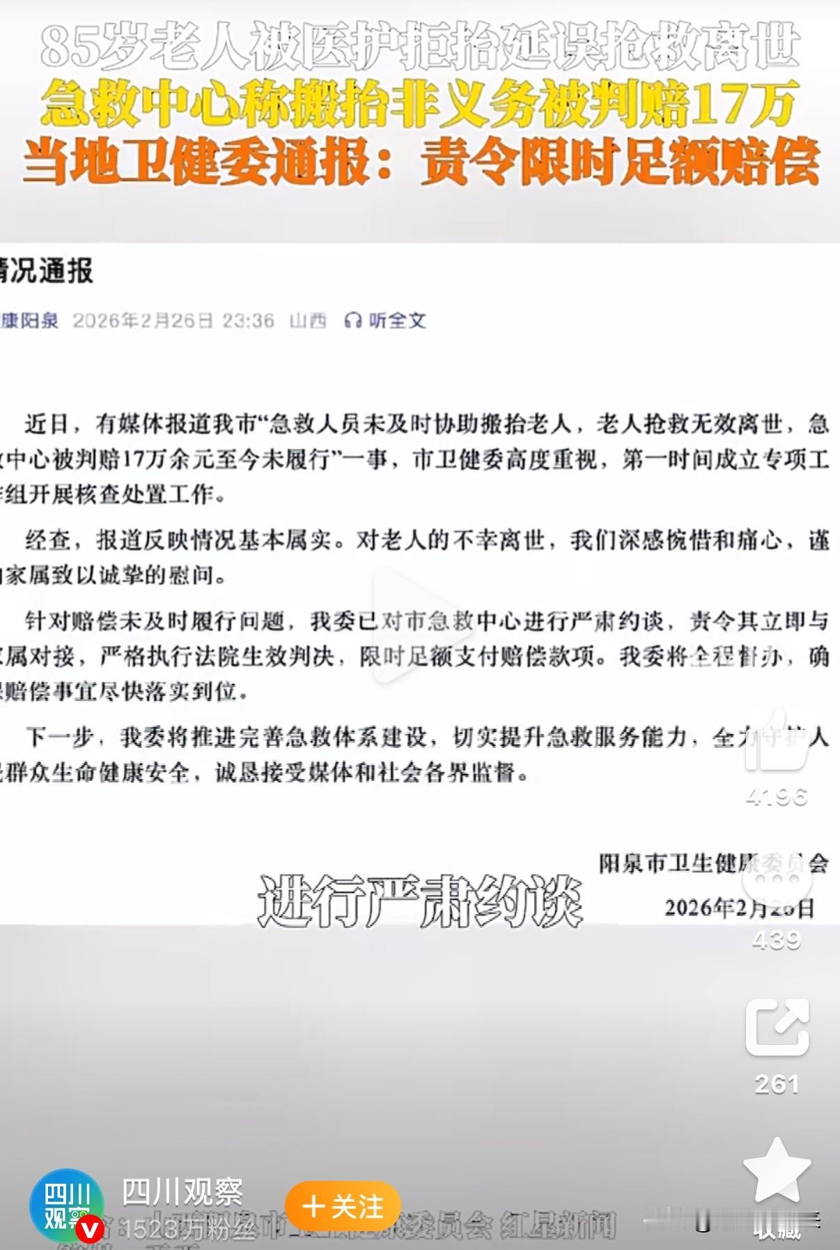 急救,急救,顾名思义就是紧急抢救,时间就是生命,需争分夺秒的抢救生命! 现实生活中,凡是打120急救电话的,都是情况非常紧急,病人万分凶险,不得已而为之! 通报中这位85岁老人,打了急救电话,急救车到了却因没有担架员而耽误了40分钟,最后遗憾去世,实在让人意难平! 悲剧让我觉得急救制度需要完善。既然是急救,就要争分夺秒抢救病人,包括担架员在内的因素必须考虑在内! 可根据搬抬的路程以及艰辛程度适当收费!我国劳动力资源丰富,对担架工适当医学培训即可,并不需要多么高深的医学知识! 我国已进入老年化社会,急救工作愈发繁琐艰巨,且迫在眉睫!此举既可完善急救制度,也可以方便劳动力就业,一举多得,何乐而不为? 君以为然否?评论区请留言!