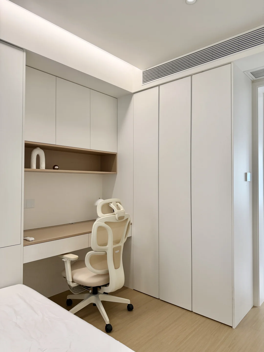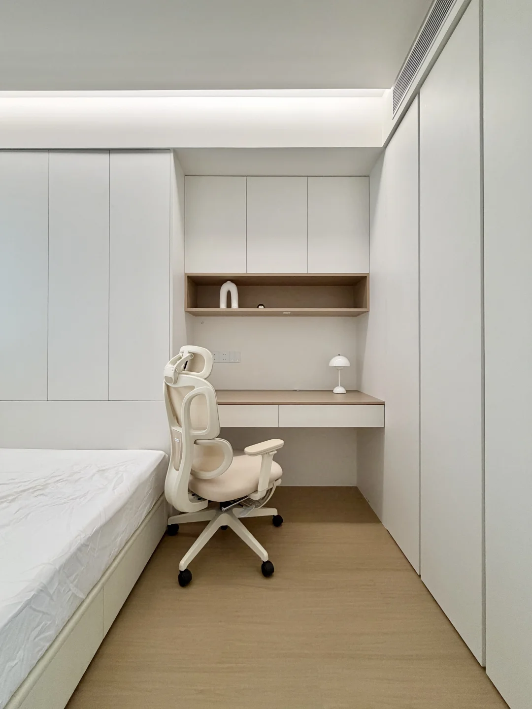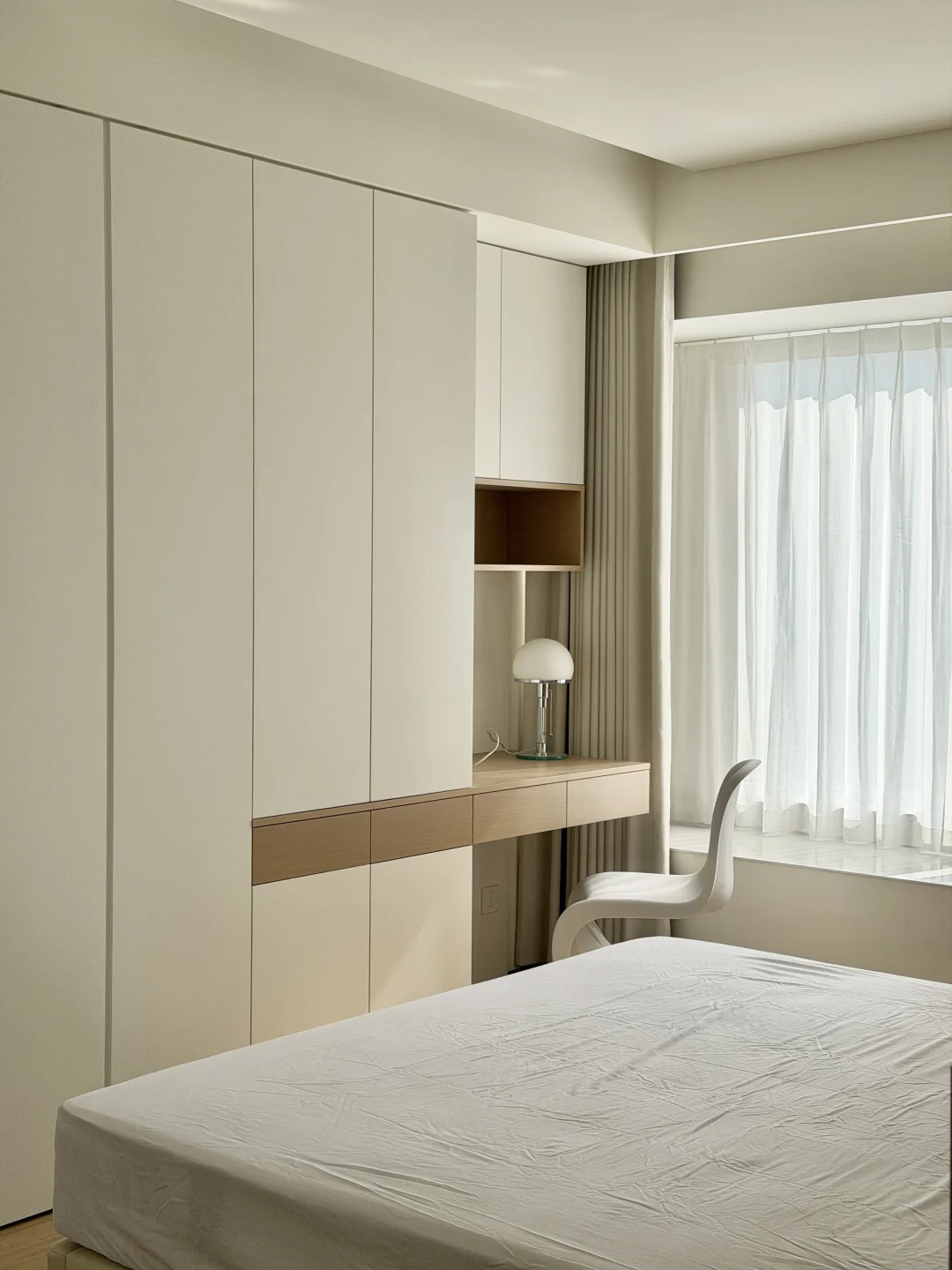 墙顶和衣柜同色系,色系统一直接把极简感拉满。
