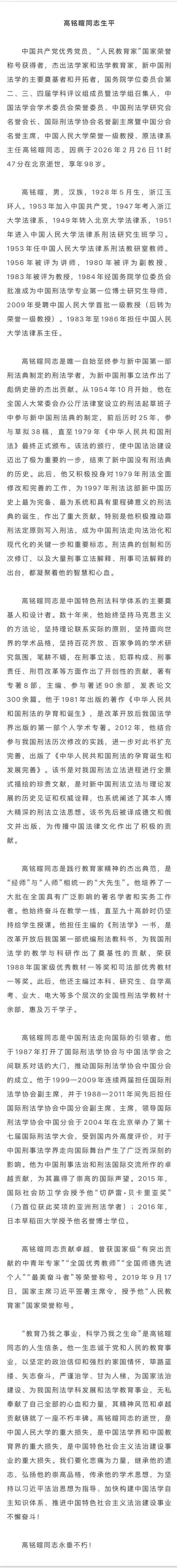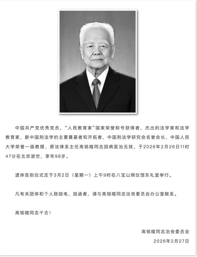 北京大学法律系1951届本科校友、“人民教育家”、中国人民大学荣誉一级教授高铭暄于2026年2月26日在北京逝世,享年98岁。