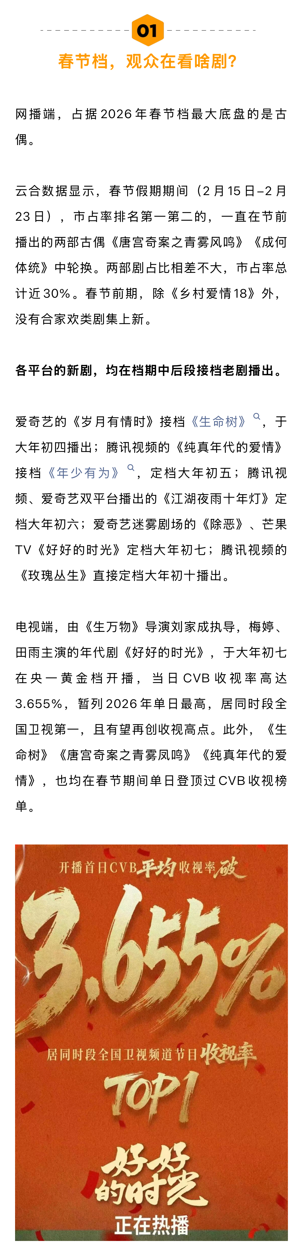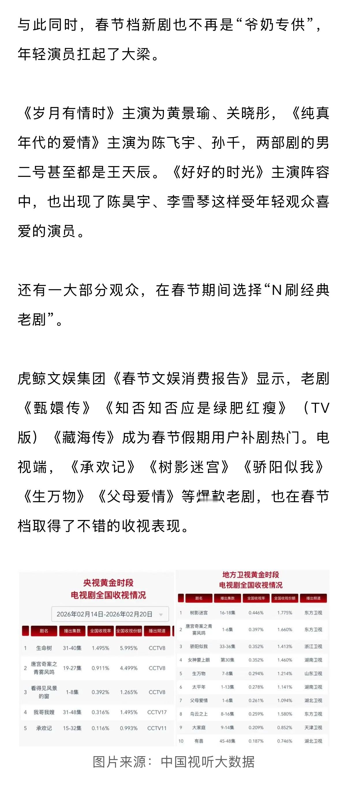 从类型上看,只有《乡村爱情18》《好好的时光》属于全民合家欢题材,《岁月有情时》《纯真年代的爱情》侧重爱情线,《江湖夜雨十年灯》更是年轻人喜欢的古装武侠题材。从热度上看,2026春节档也未出现《人世间》《狂飙》这样的全民爆款剧。这也导致网络上对春节档新剧的讨论,远不如前几年浓烈。