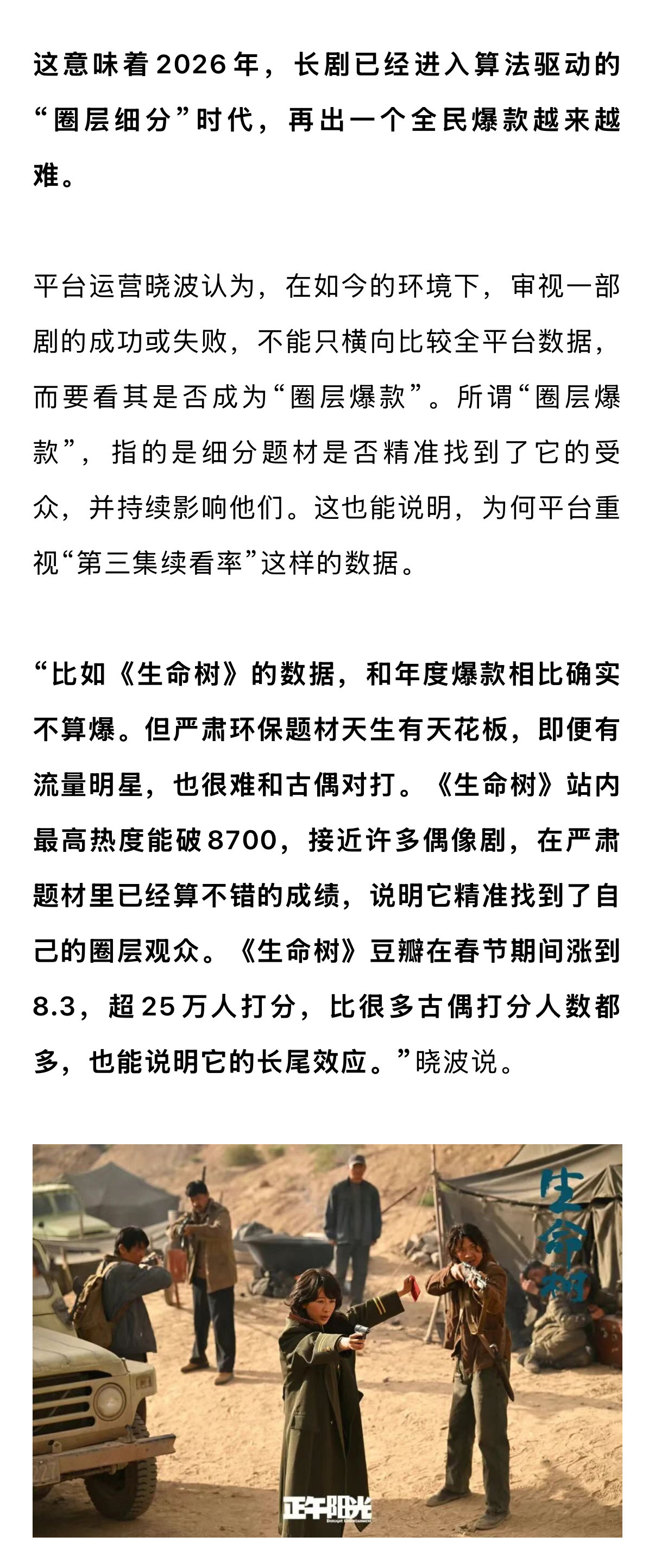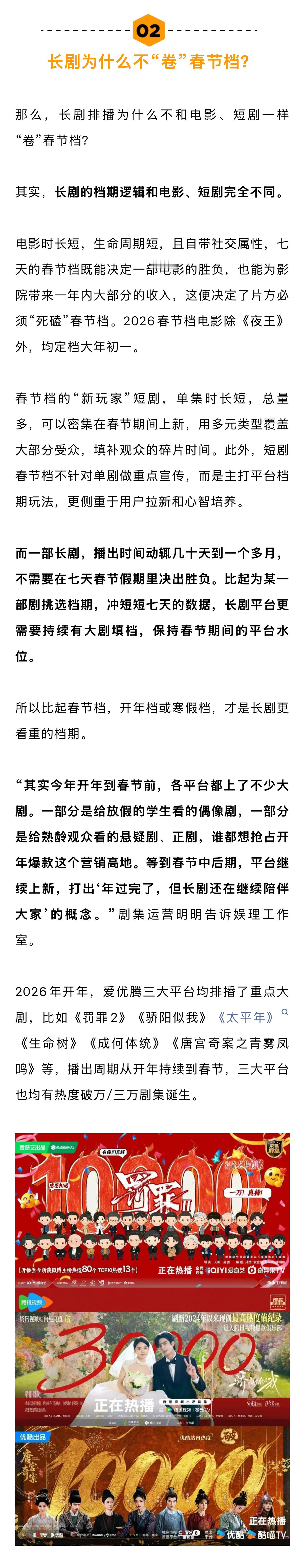 没有全民爆剧,也是2026年春节档观众的另一体感。2022年的《人世间》,2023年的《狂飙》,2024年的《南来北往》均达到了台网双爆,口碑、热度双高,且在评奖期收获无数,成为当之无愧的全民爆款。那么,是2026年的长剧越拍越差?还是平台放弃了重点布局?请看娱理独家↓