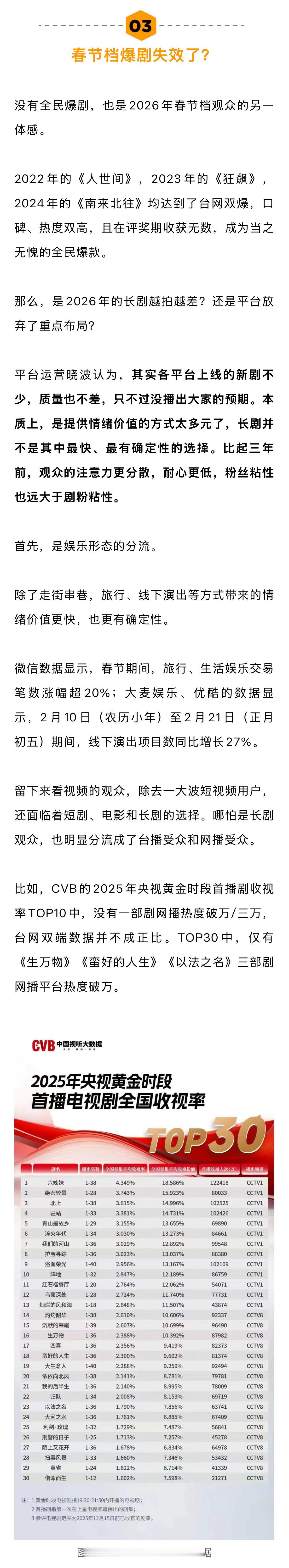 业内谈春节档为何难再出爆款剧长剧为什么不卷春节档 新浪娱乐工作室整理了近三年春节档长剧数据,并对话三位业内人士,试图寻找长剧为什么不卷春节档,以及春节档为何难再出爆款的答案。