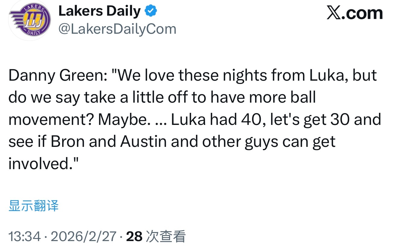 前湖人球员丹尼格林表示:“我们喜欢卢卡打出这样的夜晚,但要不要建议他稍微收一点,