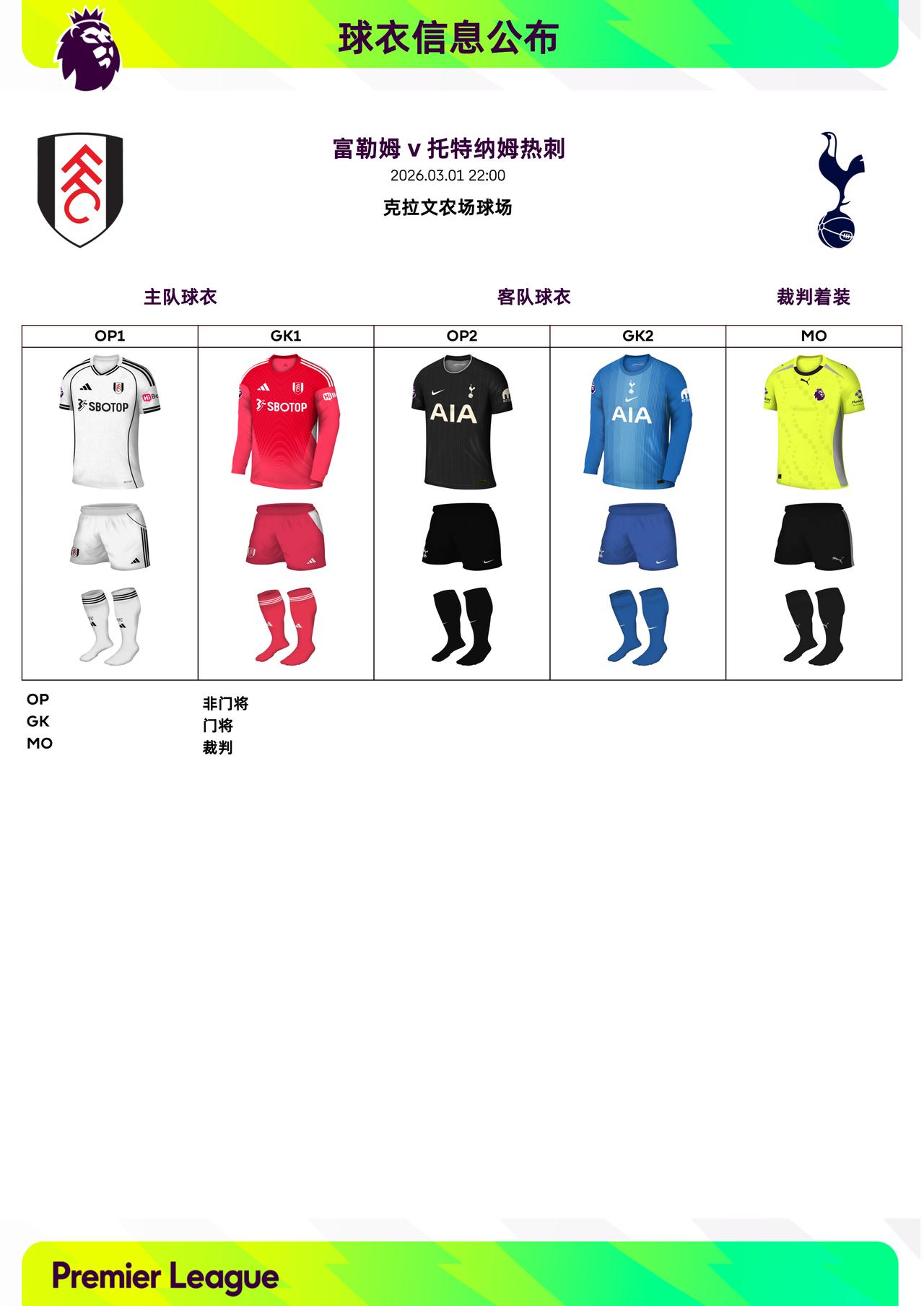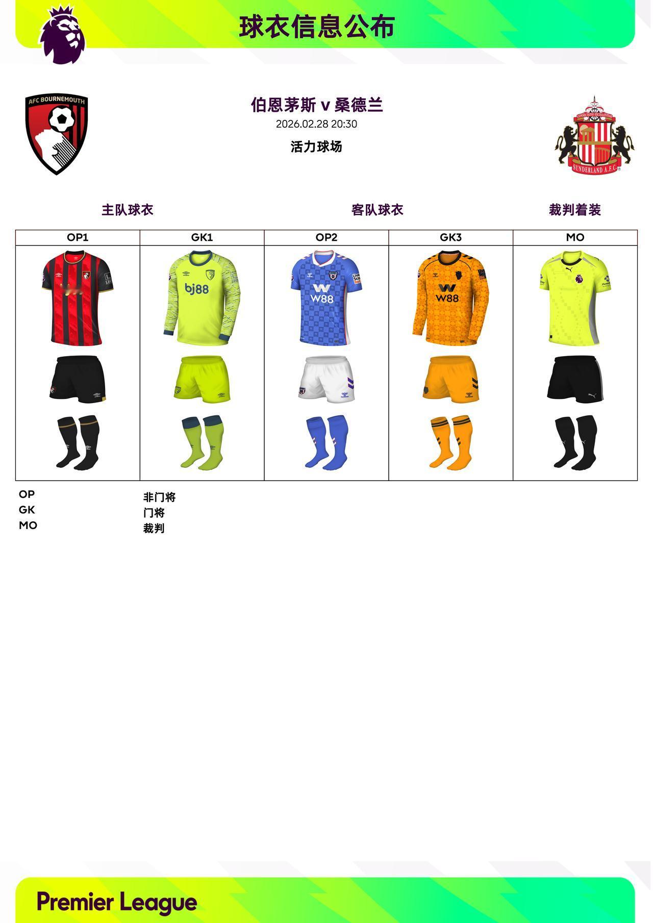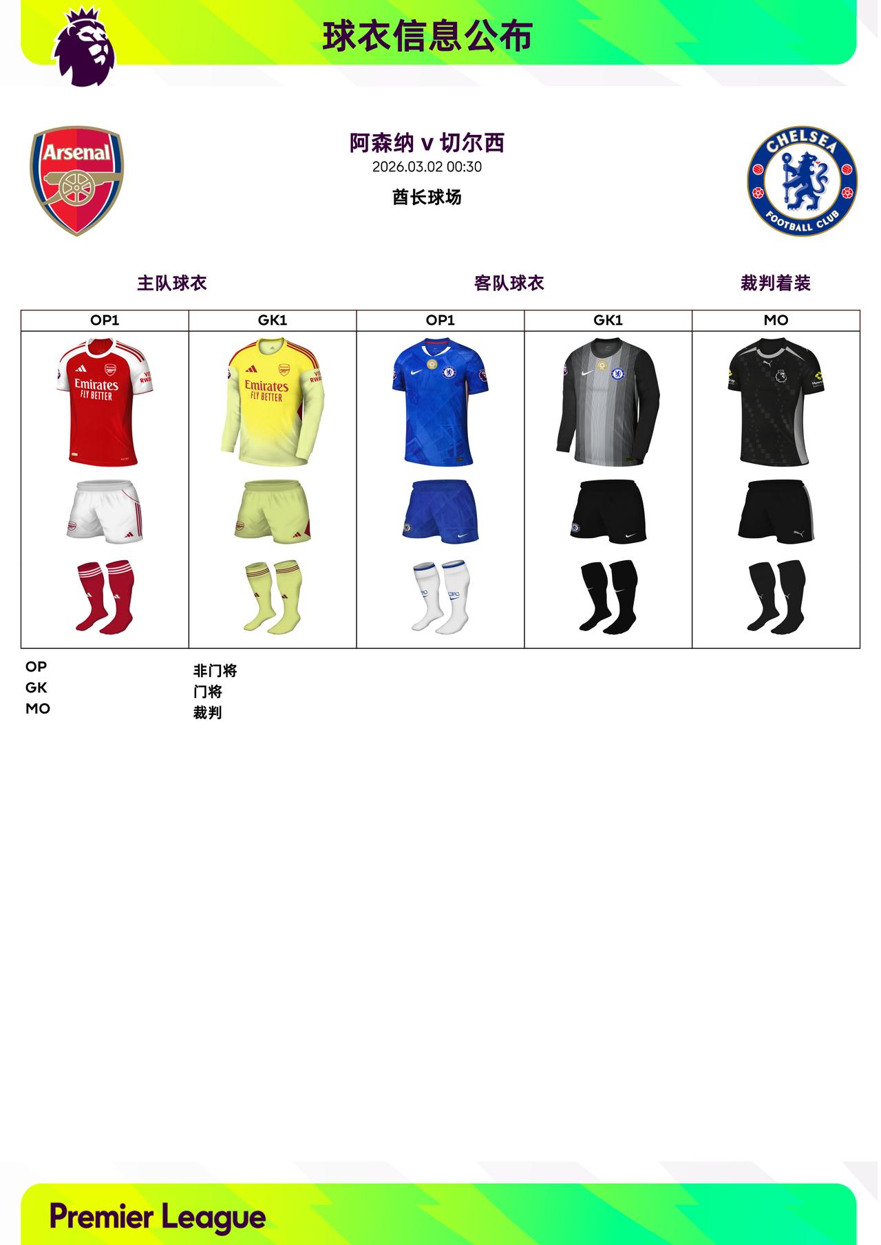 2025/26赛季英超联赛第28轮球衣信息: ◉ 焦点战——阿森纳 v 切尔西 ,双方均穿主场球衣