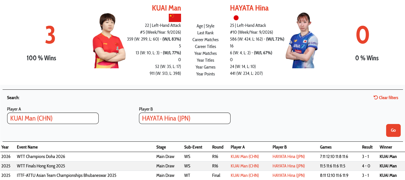 据国际乒联官方数据,蒯曼此前与早田希娜共交手三次,蒯曼保持全胜。