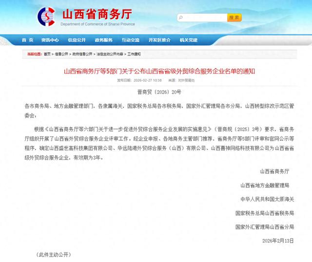 根据《山西省商务厅等六部门关于进一步促进外贸综合服务企业发展的实施意见》(晋商规〔2025〕3号)要求,省商务厅组织开展了山西省外贸综合服务企业评审工作。经企业申报、各地商务主管部门推荐,省商务厅等5部门评审和官网公示等程序,确定山西盛世高科技集团有限公司、华远陆港外贸综合服务(山西)有限公司、山西喜神网络科技有限公司为山西省省级外贸综合服务企业,有效期为3年。