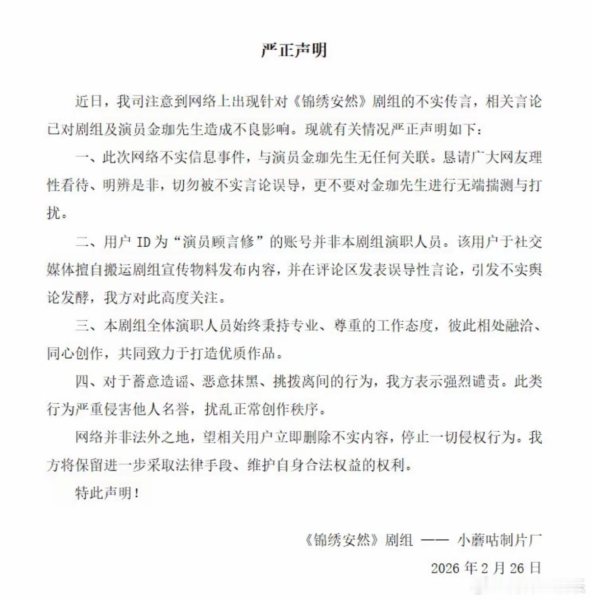 点赞工伤男演员没参演刘晓庆短剧刘晓庆短剧剧组发声26日,刘晓庆参演短剧《锦绣安然》剧组发布严正声明:“近日,我司注意到网络上出现针对《锦绣安然》剧组的不实传言,相关言论已对剧组及演员金珈先生造成不良影响。此次网络不实信息事件,与演员金珈先生无任何关联。用户ID为‘演员顾言修’的账号并非本剧组演职人员。该用户于社交媒体擅自搬运剧组宣传物料发布内容,并在评论区发表误导性言论,引发不实舆论发酵,我方对此高度关注。”