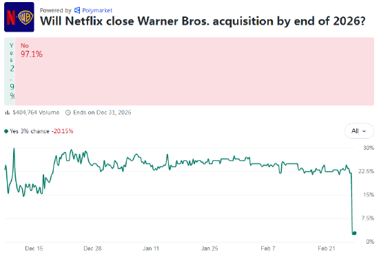 奈飞股价在盘后交易中一度大涨13%,表明投资者对公司放弃该交易表示欢迎。华纳兄弟股价下跌,因市场不再预期会出现竞购战。派拉蒙股价几无变动。