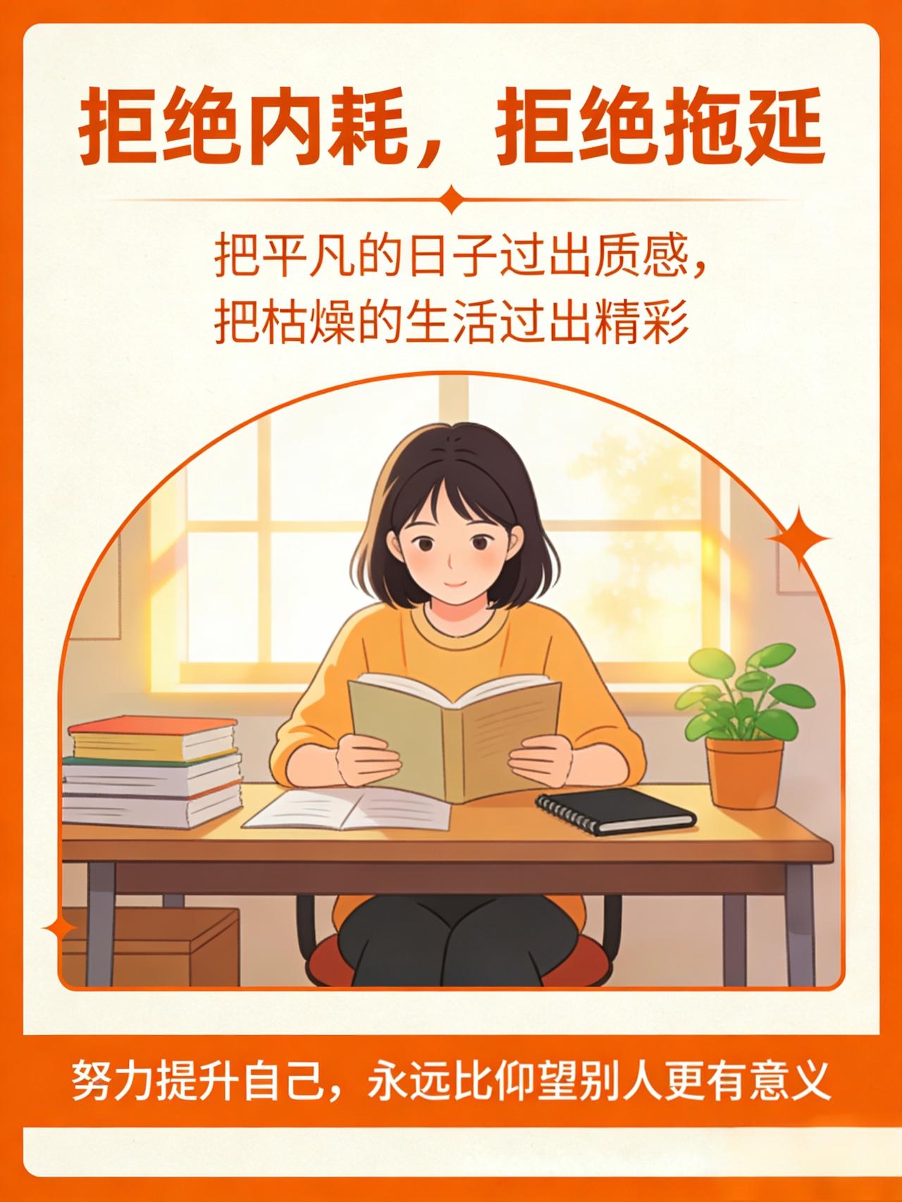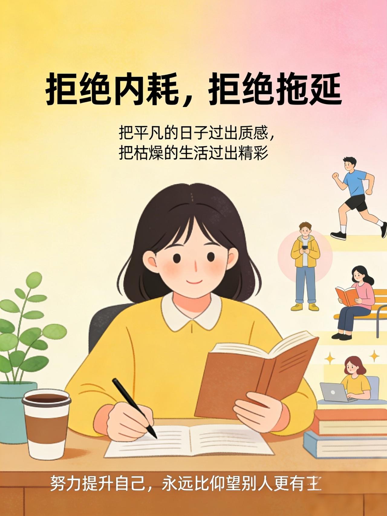 拒绝内耗,拒绝拖延。 把平凡的日子过出质感,把枯燥的生活过出精彩。 努力提升自己