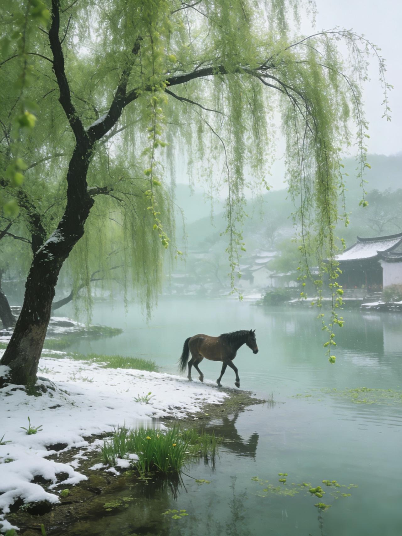 《马年春早》 江南水暖草初芽, 弱柳迎风拂碧纱。 最是晴光添暖意, 轻蹄踏雪走