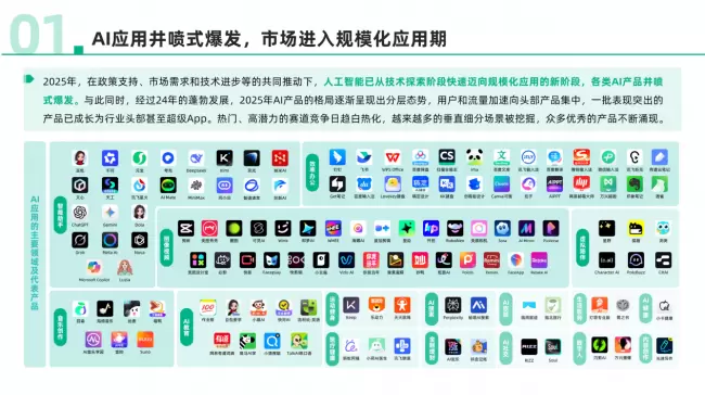 随着AI技术的加速落地,AI的应用能力正从图像视频、效率办公等热门赛道,加速向医疗等高价值场景以及更多垂直领域纵深渗透,各类AI产品井喷式爆发。头部互联网大厂纷纷加速C端AI布局,智能助手逐渐演变成“超级入口”之争的核心战场。同时,大厂也在加速向AI硬件延伸,全力抢占下一代人机交互入口。在头部厂商通过“优势深耕+新域探索”持续拓展AI应用版图的同时,越来越多的中小厂商通过技术创新与场景深耕成功突围。此外,AI在B端的生产力价值持续释放,逐步深入核心业务各环节。