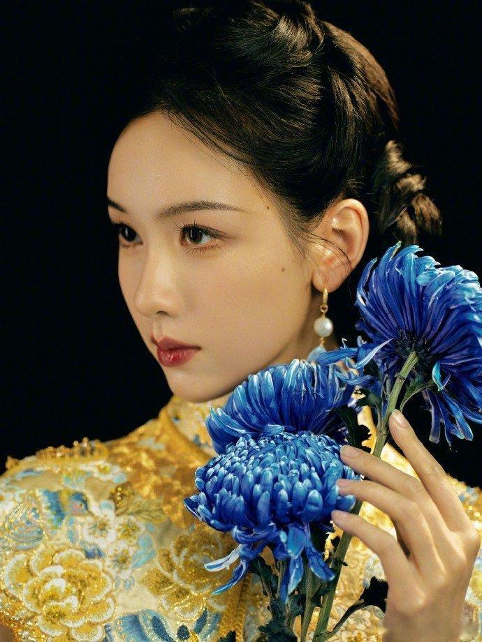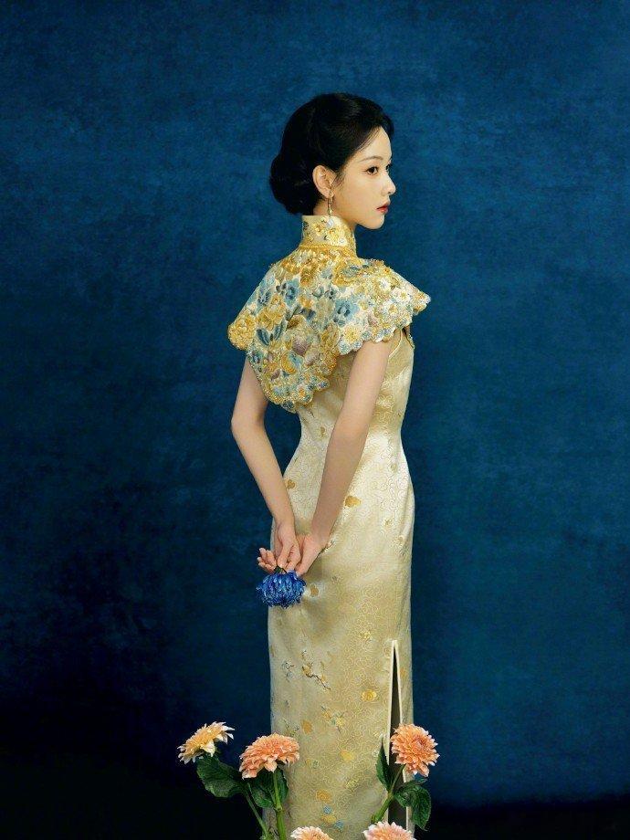 陈都灵演绎非遗美学锦缎裁云肩,宝蓝落菊影。把东方美学的贵气焊在了身上,金丝绣纹流