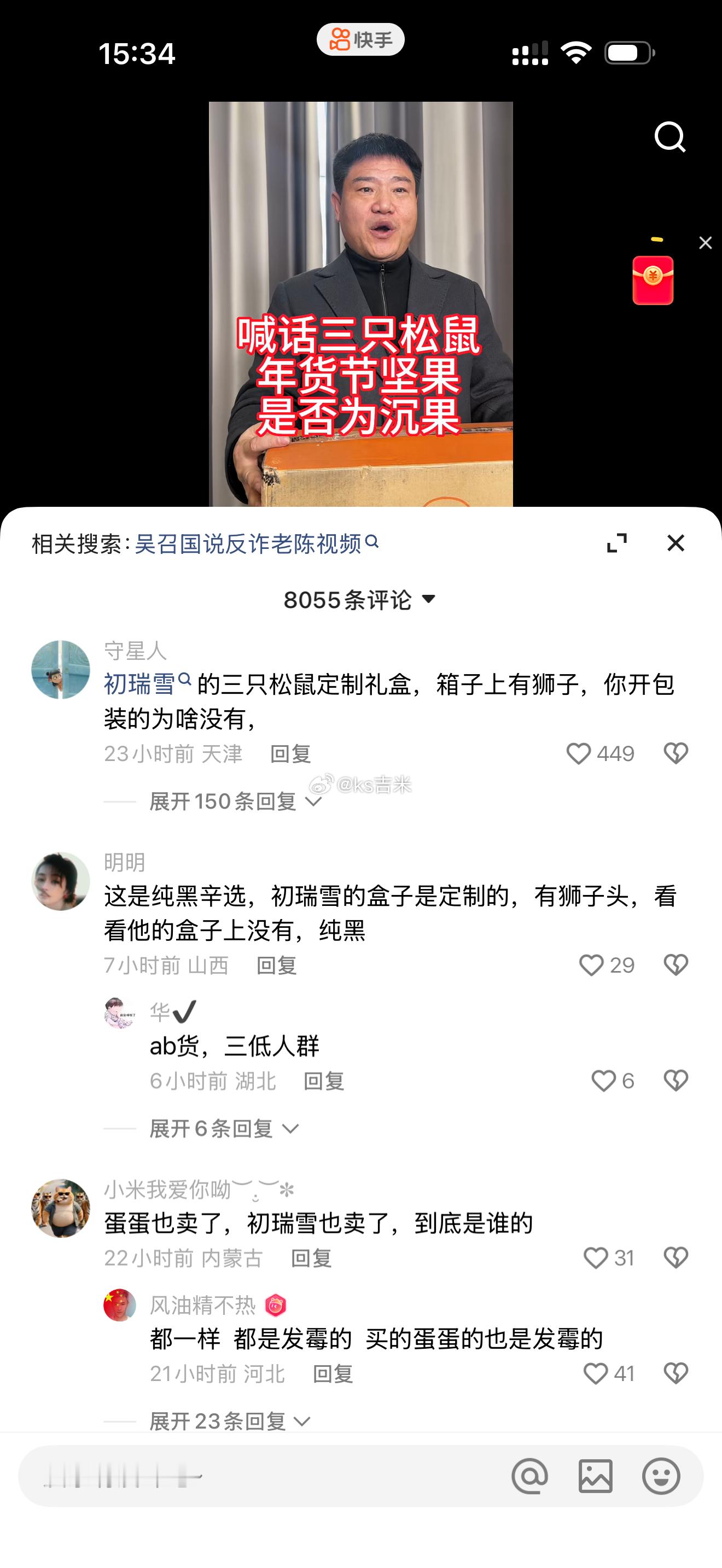 有网友质疑反诈老陈的喊话:1.初瑞雪销售的坚果是定制礼盒,箱子上有狮子,你开包装