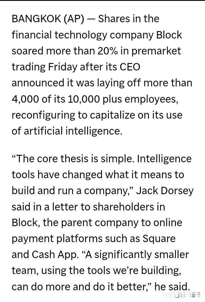 美国支付系统Block大裁员,裁减约4000人,是Block历史上规模最大的一次裁员。裁员的理由并非因为公司经营困难,是AI,认为AI改变了公司的运方式,而且这种变化还在加速。 裁员消息一出,Block股价盘后攀升23%。 🤔看来AI真的要影响我们的生活了。