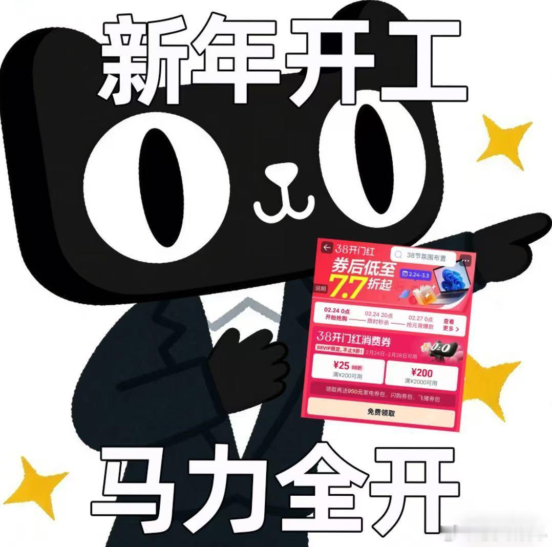 上淘宝开工淘个好彩头开工新头好全都上淘宝开工先开运,好物添好运!想焕新装备、讨个好彩头,就上天猫搜【38开门红】,官方立减8.8折起,叠加消费券低至7.7折,省钱又顺心,打工人一路开挂超顺利!