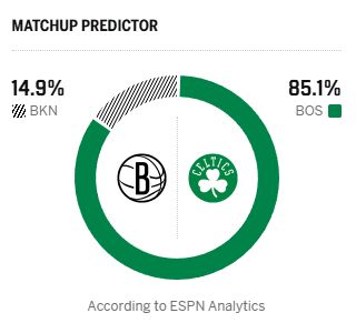 ESPN预测明日比赛:凯尔特人胜率85.1%,篮网胜率14.9%