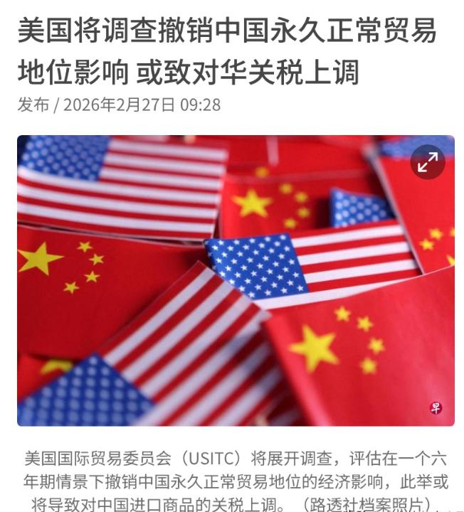 突发!仅隔一天,美国又变了,将撤销中国永久正常贸易国 2月26日,美国国际贸易委员会称,他们将展开调查,评估在一个六年期情景下撤销中国永久正常贸易地位的经济影响,目前调查已经启动将在8月21日公布结果 可能很多朋友看到这个消息会一头雾水,啥是“永久正常贸易国地位”? 说白了,这就是美国给中国的一份贸易“绿色通道”,官方名叫PNTR,本质就是最惠国待遇的永久化,简单说就是中国商品出口到美国,能享受和其他大多数国家一样的低关税,不用每年都接受美国国会的审核,省去了很多麻烦。 这份“绿色通道”可不是一直就有的,早在2000年,美国国会才正式通过法案,授予中国永久正常贸易关系地位,2002年正式生效,和中国加入WTO的时间同步。 在这之前,中国每年都要过美国国会的“关卡”,能不能继续享受低关税待遇,全看美国政客的脸色,直到2000年,这份待遇才彻底固定下来,也让中美贸易有了更稳定的基础。 很多人会问,美国好好的为啥突然要搞这个调查?其实这不是一时兴起,早有铺垫。 自从特朗普2025年1月再次就职后,就曾指示商务部长和贸易代表,评估撤销中国PNTR的相关提案,而且早在2023年、2024年,美国国会就有议员提出过类似法案,只是一直没通过。 这次美国国际贸易委员会启动的调查,看似只是评估影响,实则暗藏玄机。 根据消息,一旦真的撤销中国的PNTR地位,后果会很直接:中国出口到美国的商品,关税会从现在平均3.5%的低税率,直接涨到平均40%的非最惠国税率,再加上之前已经有的额外关税,最终平均关税可能会达到61%。 这意味着什么?中国企业出口成本会暴涨,很多商品在美国市场会失去价格优势,而美国消费者买这些商品,也要花更多的钱。 可能有人觉得,这是美国在“打压”中国,但其实这事没那么简单,美国自己也得承受代价。 要知道,中美经贸早就深度绑定,2024年中美双边货物贸易额接近6883亿美元,中国是美国很多农产品、科技产品的重要市场,比如美国大豆、棉花的一半以上出口都依赖中国,苹果、高通等巨头也离不开中国市场。 一旦撤销PNTR,这些美国企业的利润会暴跌,农民的农产品会积压,最终受伤的还是美国普通民众和企业。 而且大家不用太担心,这次调查只是“评估影响”,不是直接就撤销。 根据美国的流程,撤销PNTR需要国会立法通过,总统不能单独决定,而美国国内的企业联盟、农业协会都会坚决反对,毕竟谁也不想放弃中国这么大的市场。 另外,WTO明确规定,成员之间要无条件给予最惠国待遇,美国单方面撤销PNTR,本身就违反了国际规则,会遭到全球各国的谴责。 还有一个关键点,这次调查会评估两种情景,一种是直接撤销后的六年影响,另一种是对涉及国家安全的产品,分五年逐步提高关税。 这也能看出来,美国内部对此也有分歧,不是所有人都想一下子和中国“脱钩”,毕竟“杀敌一千、自损八百”的买卖,谁也不想做。 其实这些年,美国一直在中美贸易上反复横跳,一会儿加征关税,一会儿又搞调查,本质上就是一场政治博弈。 美国政客想通过这种方式,讨好国内部分选民,同时逼迫中国在一些领域让步,但他们忽略了一个核心事实:全球供应链早已深度融合,中美“你中有我、我中有你”,彻底脱钩不符合任何一方的利益。 当然,我们也不能掉以轻心。虽然调查结果要到8月21日才公布,最终能不能撤销还很难说,但中国早就做好了应对准备。 这些年,我们不断拓展和欧盟、东盟等国家的合作,加快推进RCEP实施,降低对美国市场的依赖,同时强化国内大循环,推动产业升级,就算真的出现变化,也能从容应对。 总的来说,这次美国启动调查,更像是一次“极限施压”,而非真正的“脱钩”信号。中美之间的经贸博弈会是长期的,但合则两利、斗则俱伤,这是不可改变的事实。