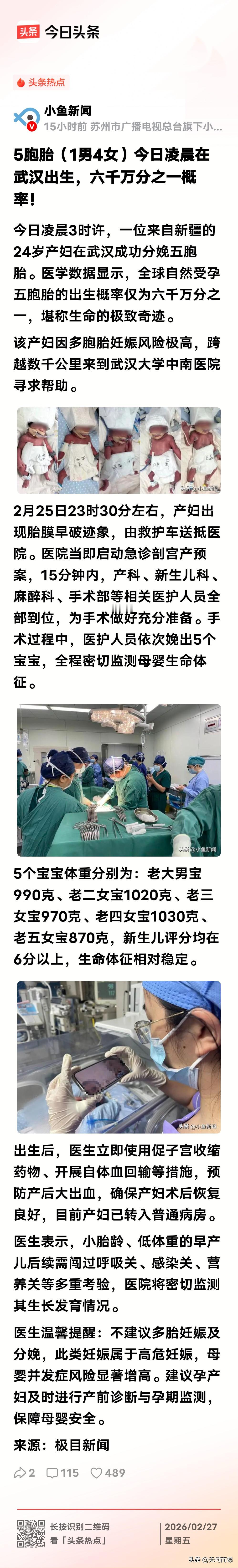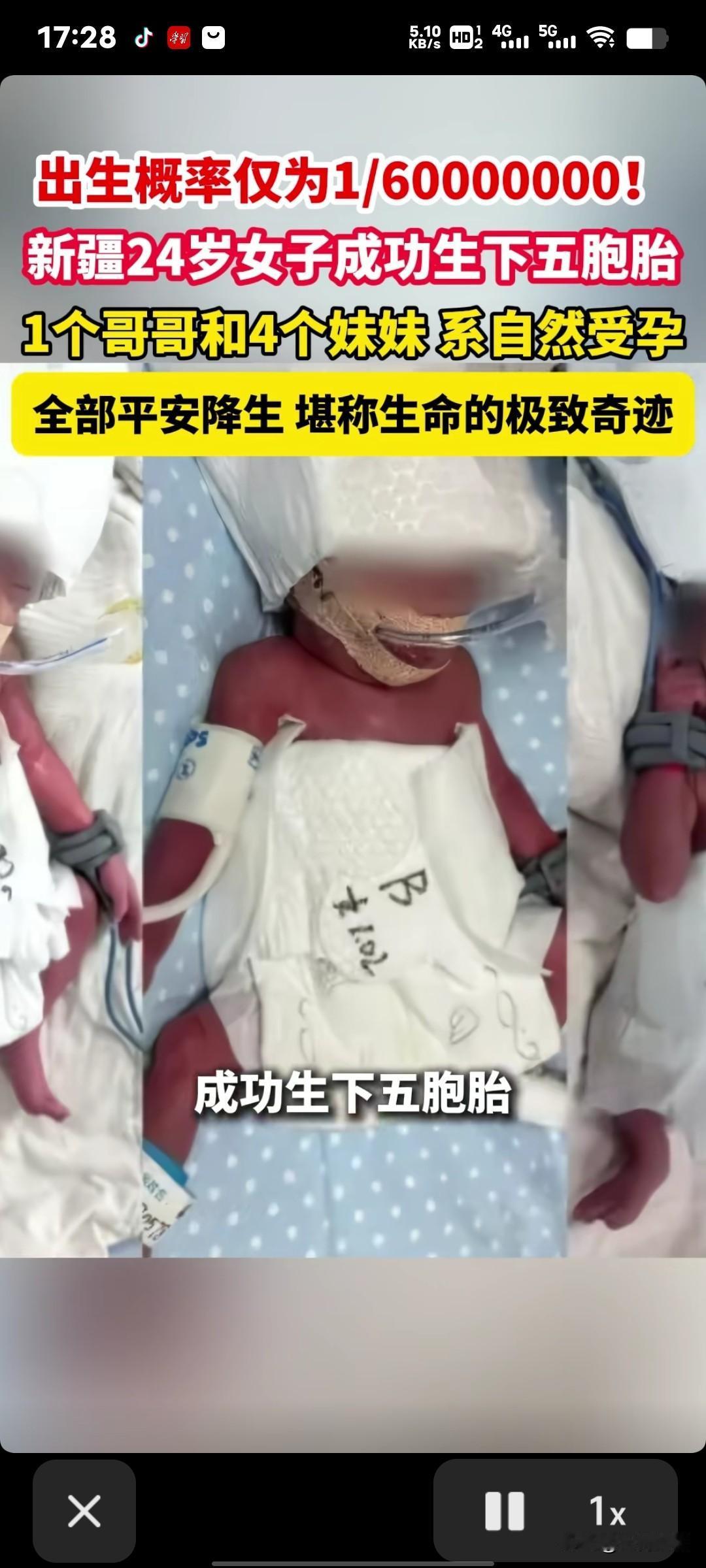 新疆24岁的女子,生下了五胞胎,四个女孩,一个男孩,一次生下五胞胎,这是非常罕见的,据说概率仅是六千万分之一。一次生下五个孩子,对孩子的父母来说,是一件非常高兴的事情,但是要把这五个孩子拉扯长拉扯人,需要付出的时间和精力可就相当大了,生育、养育、教育,都需要一笔钱,条件不好的,真拉扯不起呀!