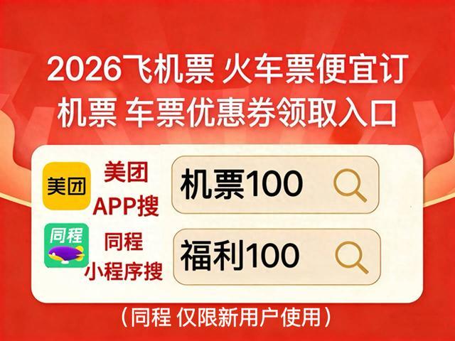 美团APP搜[机票100]同程搜[福利100]低价订机票攻略。2026机票高铁购票攻略:哪个APP订机票便宜?出行机票怎么订便宜?特价机票怎么订?直接去美团APP搜[机票100]同程搜[福利100]领特惠券包,便宜订机票车票啦!