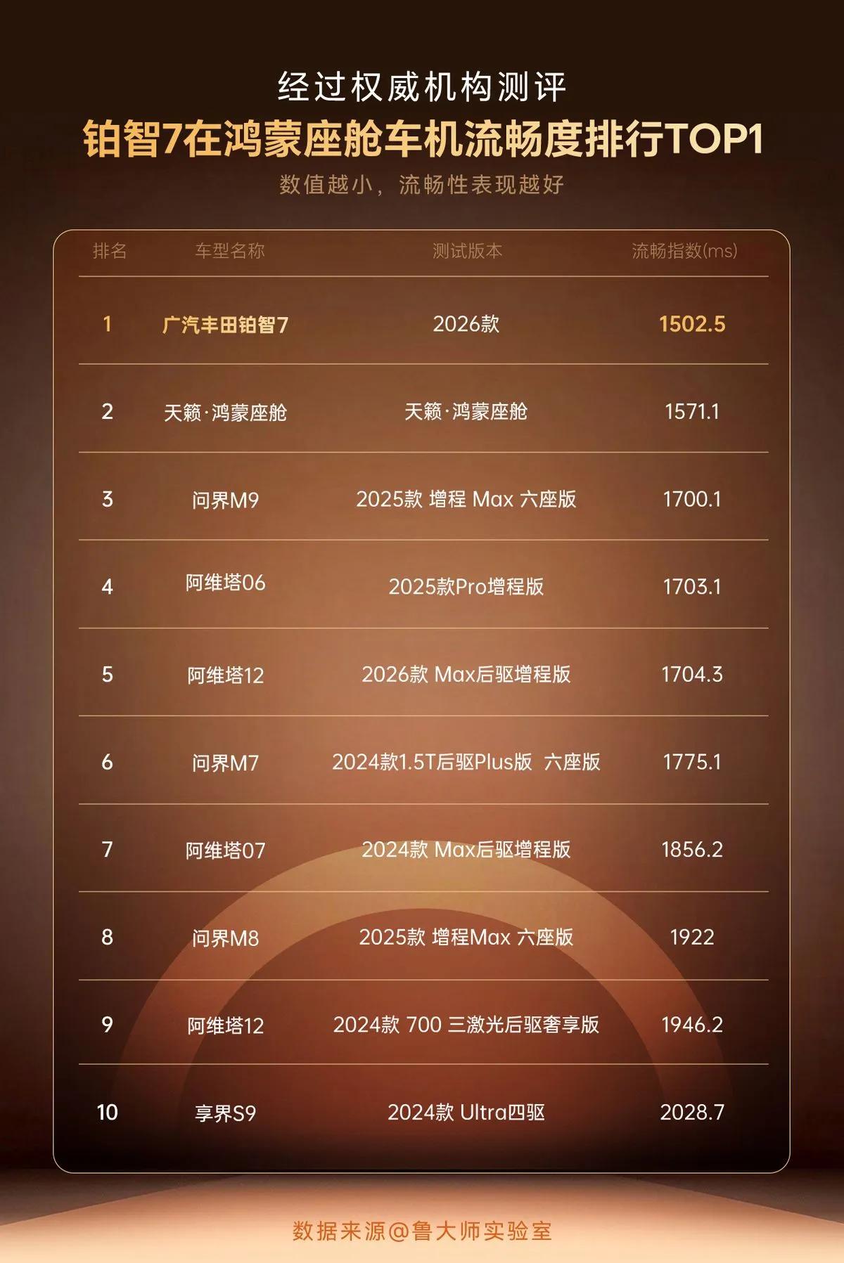 鲁大师最新驾舱流畅度实测榜单来了,你知道第一是谁吗?绝对会出乎你的意料!没错这款车型就是广汽丰田铂智7! 2月27日,广汽丰田官方正式对外宣布,备受瞩目的新款车型铂智7的全能解决方案与预售发布会,将于3月5日盛大开启。这款车曾在2025年广州车展上惊艳登场,它定位为中大型纯电轿车,将目光精准锁定在20万级市场,且计划在3月内完成正式上市。 从车身尺寸来看,铂智7表现十分出色,长宽高分别为5130/1965/1506mm,轴距长达3020mm,后排全平地板设计让乘客的腿部空间更为充裕,舒适性大幅提升。 作为广汽丰田本土化合作的诚意之作,铂智7科技感满满。它全系标配鸿蒙座舱5.0系统,搭载Momenta R6高阶智驾辅助方案,再加上车顶的激光雷达,可轻松实现城市与高速路况下的导航辅助驾驶。在鲁大师最新驾舱流畅度实测中,铂智7成绩斐然,作为丰田首款搭载MoLA大模型的车型,其鸿蒙座舱5.0以优异表现,在众多参测车型中脱颖而出,实力强劲。