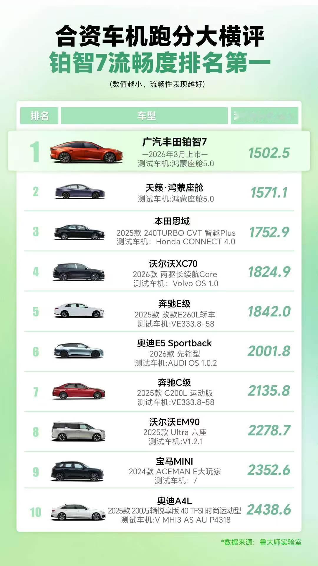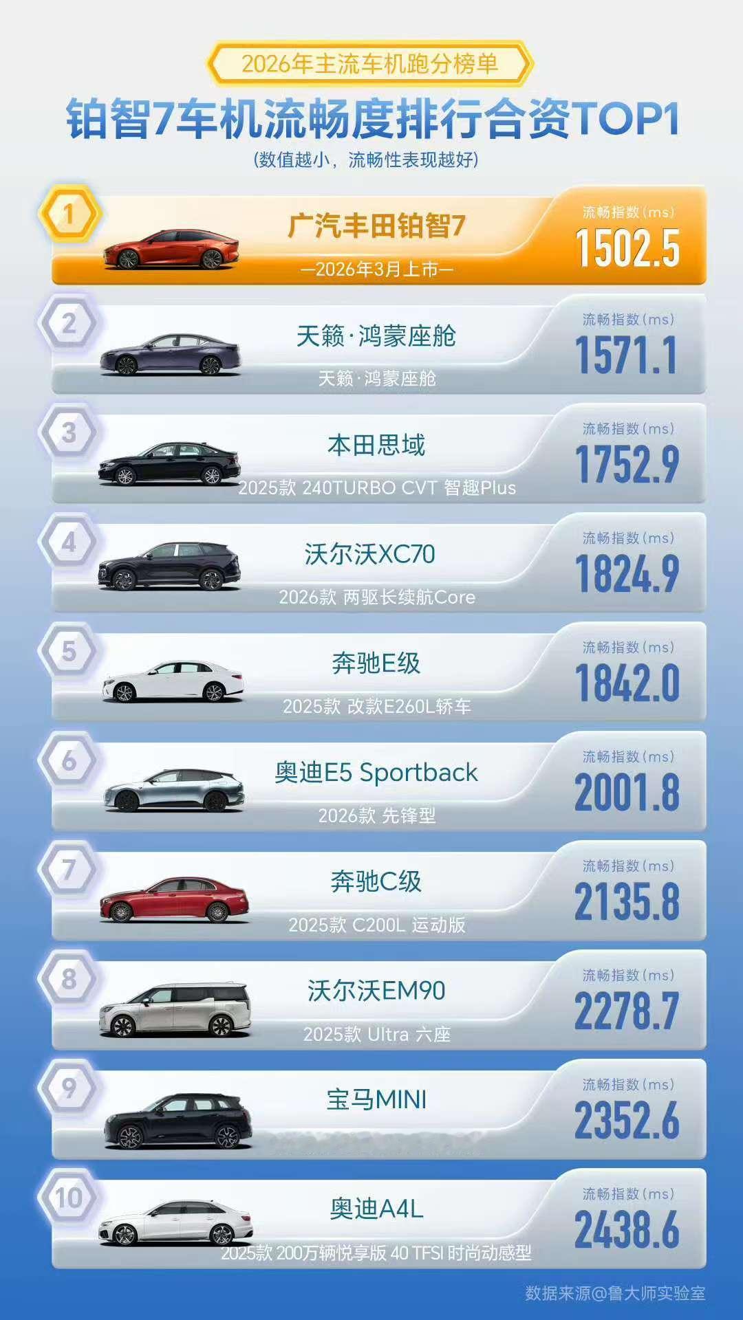 丰田铂智7MoLA大模型首测看了最新的车机流畅度测试,广汽丰田铂智7的表现确实超出预期,车机终于能跟上大家用手机的流畅习惯了。这次鲁大师的测试数据很实在,铂智7的整体流畅指数排到了榜首。尤其是3D交互的响应速度,还不到100毫秒,手一划屏幕,画面立马就跟上,没有半点拖泥带水的感觉。导航规划路线、双指缩放地图这些常用操作,也都快得很,不用等着车机“反应半天”。更关键的是,它在20万这个价位里,是少有的搭载了最新鸿蒙座舱5.0的D级车。以往大家总觉得合资车机又笨又卡,铂智7这次算是打破了这个老印象,既保留了丰田的品质,又把智能车机的流畅度拉到了新高度。3月5号这款车就要开启预售了,对于想买合资车,又不想妥协车机体验的朋友来说,确实可以重点留意一下。铂智7定档3月5日预售发布