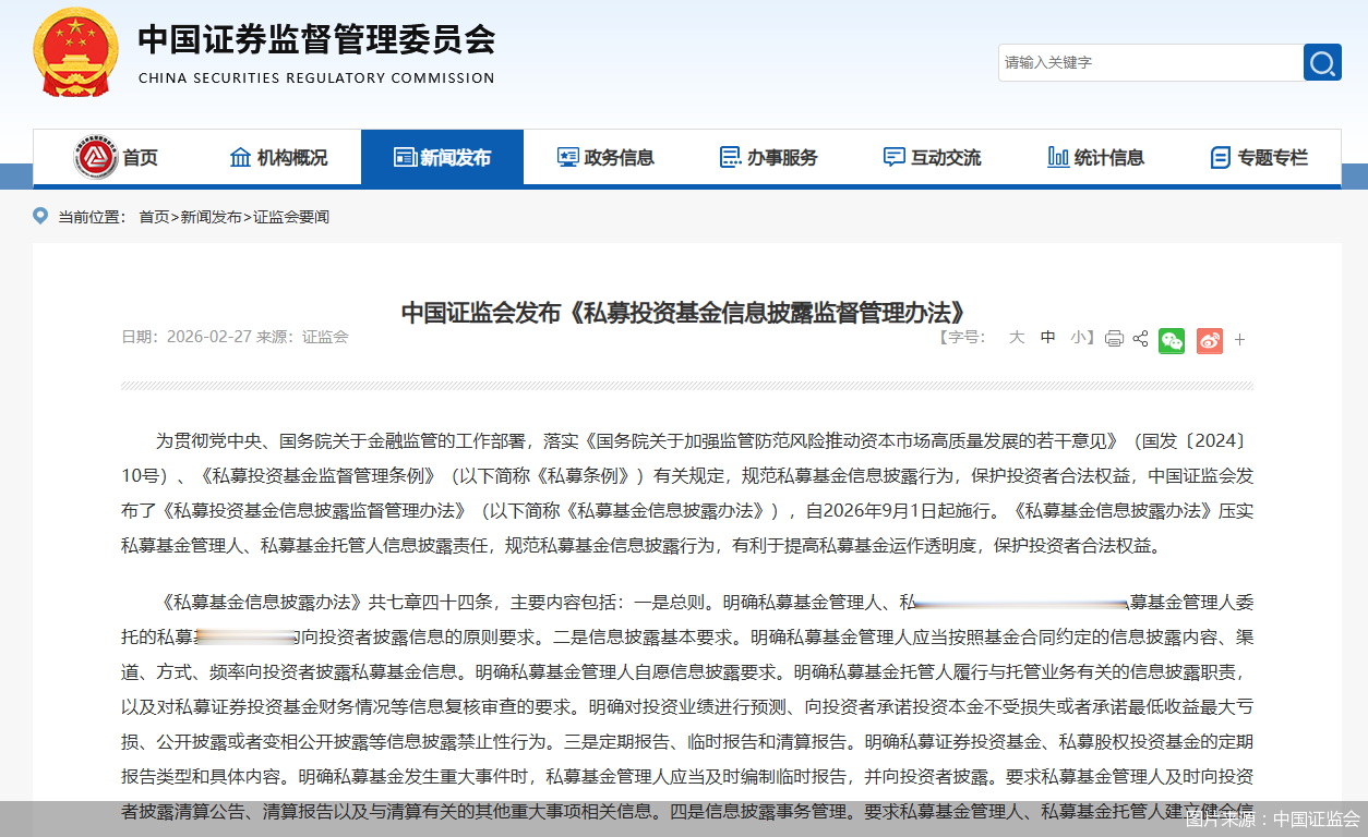 北京商报讯(记者李海媛)2月27日,中国证监会发布了《私募投资基金信息披露监督管理办法》(以下简称《私募基金信息披露办法》),自2026年9月1日起施行。
