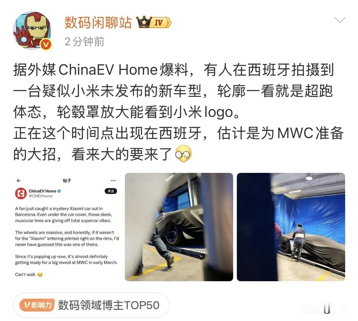 小米要出超跑了? 就在刚才,有媒体拍到了疑似小米的新车型,,拍摄地点在西班牙,由于整个车都是被黑布罩住的,所以只能看到一个大概的轮廓! 但即便如此也能够看到,这是一辆底盘非常低的超跑,根据这个媒体朋友的描述,他们把轮毂放大了,能够看到小米的标志,那么在某种程度上,就说明这个车多多少少会与小米有点关系。 而有许多媒体朋友以及汽车圈的朋友,现在正要出发去到西班牙,参加一年一度的MWC会,不知道小米是否会选择在这个时候亮出他们的新产品。 因为目前大家已经明确知道,他们有一款大型的SUV,以及小米SUV的升级改款,如果再加上这个跑车的话,那么至少他们有三款完全不一样的新车,准备在今年发售。