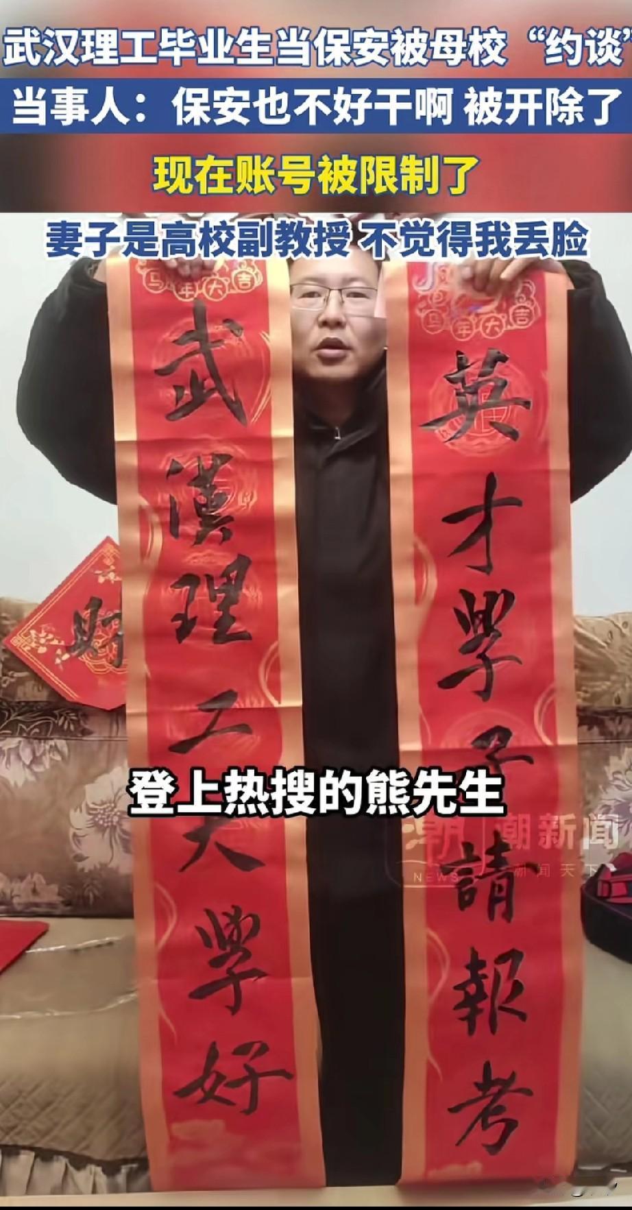 武汉理工大学毕业生, 最后去做了保安, 本来想着做自媒体发财, 分享自己的创业经历, 给那些毕业的大学生参考参考, 没想到直接火了, 还被母校进行了约谈, 最后他还被开除了, 保安都干不了了, 不过他表示自己不是恶意抹黑母校, 只是当时毕业后的几份工作都不好, 后来创业三年还失败了, 失业三年后不得不去做了保安, 人生就是这个样子, 普通人读书再好, 最后找不到工作一切白搭, 不过幸运的是他的媳妇儿是副教授, 工资也不少,可以养活他, 而且他家中还有两三套房子, 可以说是吃喝不愁, 只不过是想找点事儿干干, 如果真的是一穷二白的农村娃, 那可真的是太惨了, 现在上大学也不一定能有好工作, 所以说,就是看个人了! 大家对于武汉理工大学毕业生做保安怎么看? 武汉理工 武汉保安 武大保安大叔