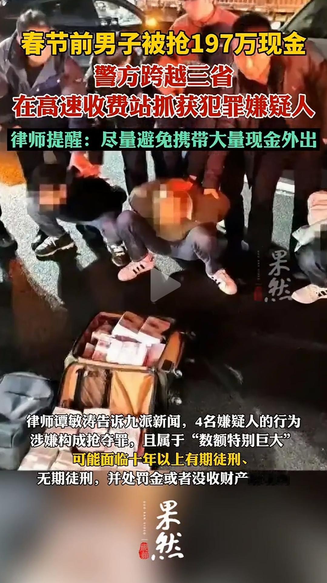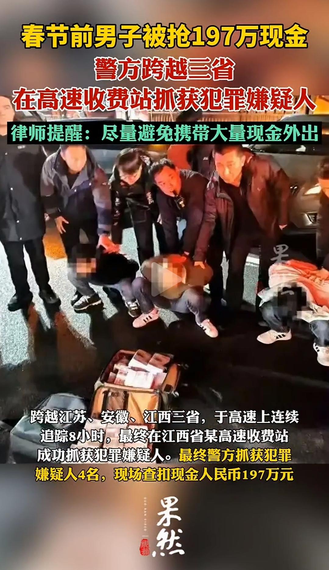 男子遭遇抢劫,损失现金197万元及一部手机。2月23日春节前夕,江苏泰州公安海陵分局接到警情后,立即成立专案组,快速研判锁定嫌疑人身份及活动轨迹后即刻出发,跨越江苏、安徽、江西三省,于高速上连续追踪8小时,最终在江西省某高速收费站成功抓获犯罪嫌疑人,并当场扣押涉案财物 这起发生在春节前夕的惊心动魄案件,几乎让人觉得像是一部悬疑大片。司空见惯的抢劫案里,受害人损失的现金高达197万元,这不仅是一笔天文数字,更是他多年积累的血汗钱。失去这么多,任何人都会感到绝望和无助。 但令人振奋的是,案件并没有让人陷入绝望。江苏泰州公安海陵分局接警后迅速行动,组建了专案组,展现出了令人敬佩的专业与效率。不到一天的时间,警方在跨省多地连夜追踪,历时8小时高速公路上的严格布控和穷追猛打,最终锁定并成功抓获犯罪嫌疑人,这一波操作堪称破案教科书。 细想这背后,公安干警们面对的是节日期间日益复杂的安全挑战,但他们依旧挺身而出,用行动守护着每一个家庭的安宁。尤其是在这样一个本该和家人团聚、共享天伦的时刻,他们却耗费了大量精力和时间,只为还受害人一个公道。 更值得注意的是,这起案件透露出当前社会治安形势中隐藏的风险:大额现金的携带与管理安全,个人财产的保护如何在现代社会得到更好的保障,这些都是摆在我们面前亟需思考的问题。那位受害人失去的不仅仅是钱,更是安全感、信任感甚至是对生活的期待。 或许,正是这场春风一般的正义追捕刷新了我们对安全的认知,也点燃了人们对法律和公正的信心。每一个被保护的生命和财产,都是社会安定的基石,而这基石的稳固,需要我们每个人共同维护和珍惜。 你有没有遇到过类似的安全隐患?或是在关键时刻感受到法律的保护力量?欢迎留言分享你的故事,和我们一起见证正义的到来,探讨如何更好地守护我们的生活安全!春节前夕男子197万遭遇抢劫 江苏警察8小时追回197万抢劫案