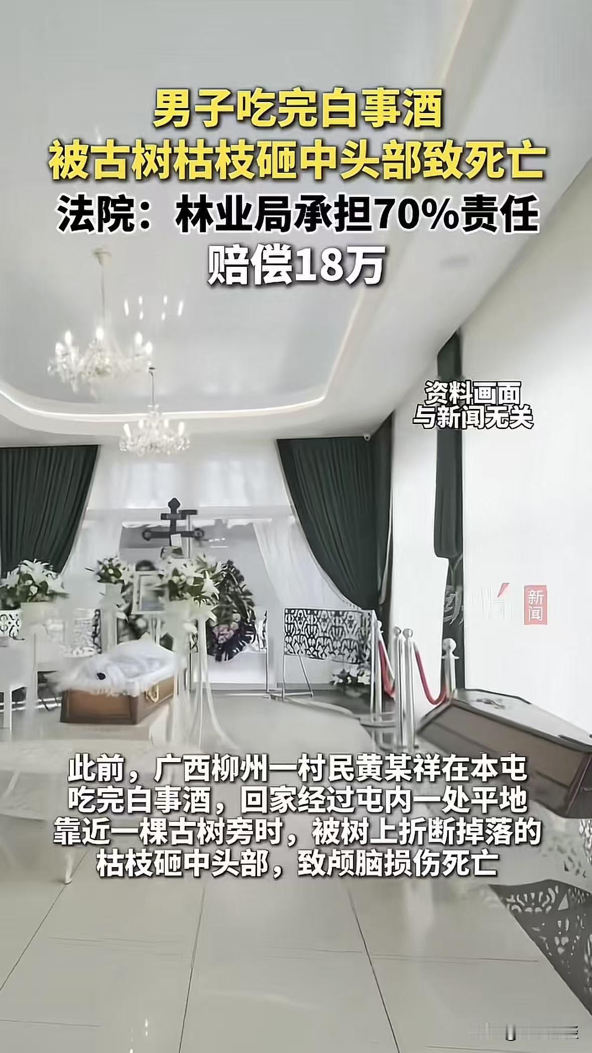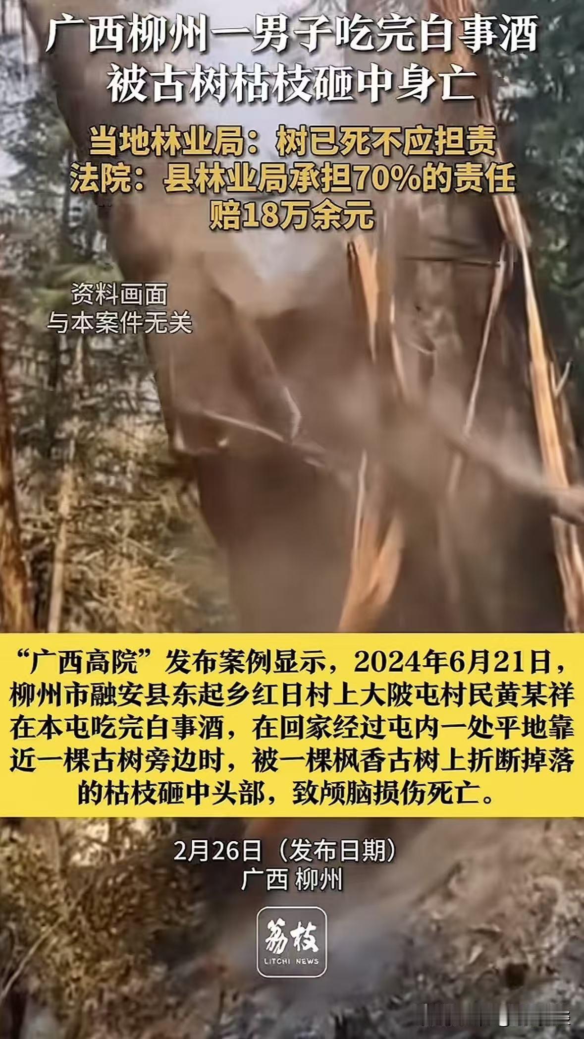广西柳州,男子酒后回家路上,被一颗160年树龄的枫香古树上的枯枝,砸中头部,致颅脑损伤离世,男子家属得知此事悲痛欲绝,两个月前这树就掉过树枝砸到过村民的房子,村里找相关部门处理,一直没等到解决,现在直接把人砸没了,男子家属找古树所属人要求追究责任,对方告诉他们这树之前出事已经跟林业站报告过,让他们去找林业局,可林业局又说这古树已经枯死已经注销,自己不应承担管理人责任,男子家属一气之下将他们一起告上法庭,没想到法院最后这样判了! 谁能想到,吃完一场白事酒回家的路上,竟会被一棵枯树的枝丫砸中,直接丢了性命。 2024年6月21日,村民黄某祥刚参加完村里的白事酒,心里还揣着几分伤感,慢悠悠往家走。 路过村头那棵160年树龄的老枫香树时,头顶上一根粗壮的枯枝突然断裂,狠狠砸中了他的头部。 由于太突然,巨大的冲击力让他瞬间倒地,连个求救的机会都没有,就没了意识。 后来有村民路过,看到黄某祥倒在地上,赶紧叫人来把他紧急送到医院。 可天不遂人愿,还是没能抢救回来,最终因颅脑损伤离世。 一条鲜活的生命,就这么猝不及防地没了,家人的天,瞬间塌了。 其实而这棵夺人性命的枫香树,可不是普通的树,它树龄足足160年,是挂牌保护的古树。 可这棵树其实早就病入膏肓了,树干枯朽不说,之前还掉过枝丫砸中过村民的房子。 村里发现隐患后,在2024年4月就上报给了林业部门,希望他们来处理。 可林业局不知道当时咋想的,在5月的时候,直接注销了这棵树的古树名录。 可这事就只在内部走了流程,既没跟村委、村民通报结果,也没摘掉树上的保护牌,更别说派人来修剪枯枝、清理隐患。 那棵枯树就还立在原地,枝丫摇摇欲坠,直到把发生了砸人事后,发生了无法挽回的杯句。 黄某祥的家属咽不下这口气,将古树的管理人及林业局均告上了法庭,要求他们为亲人的离世讨个说法。 可庭审中,林业局却理直气壮地辩称,这棵树已经死亡并被注销古树名录,他们不再负有管理责任,不该担责。 家属不理解,难道树死了,就没人管了?明明知道有危险,放任不管,最后出了人命,就可以全身而退? 好在法院的判决,给了家属一个公道。 《民法典》第1275条:因林木折断造成他人损害,林木的所有人或者管理人不能证明自己没有过错的,应当承担侵权责任。 林业局只是内部注销了古树,既没公示,也没做任何排险处理,说白了,管理责任压根就没灭失。 作为法定的管理者,他们明知古树有严重的安全隐患,却迟迟不采取有效措施,这就是实打实的重大过错。 最后判决,融安县林业局承担70%的赔偿责任,赔偿黄某祥家属死亡赔偿金、丧葬费、精神抚慰金等共计182627.90元。 可林业局不服提起上诉,二审经过审理驳回上诉,维持原判。 说到底啊,这事儿根本不是树死不死的问题,是做事的人有没有责任心的问题。 树枯了有隐患,上报了就该实打实处理,不是躲在办公室里走个内部流程就完事了。 村民的命是实打实的,安全更是容不得半点糊弄和推诿,但凡早一步把枯枝清了,也不会出这人命悲剧。 虽然钱赔了,但黄某祥的生命再也回不来了,那笔18万的赔偿,不管怎样也弥补不了家属心中的伤痛。 只希望这事能给所有管事的提个醒,手里的责任卸不掉,该办的事别偷懒,不然到头来,终究要为自己的行为买单! 对此,你怎么看这件事! @静心法谈 学法辨是非,慬法不吃亏。
