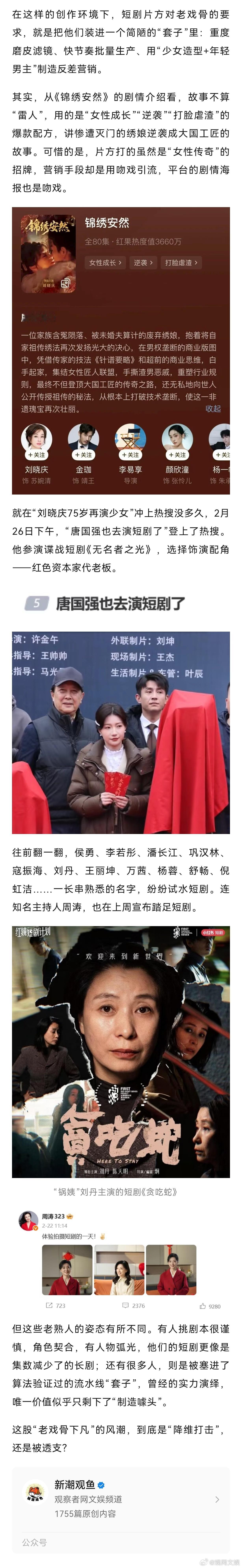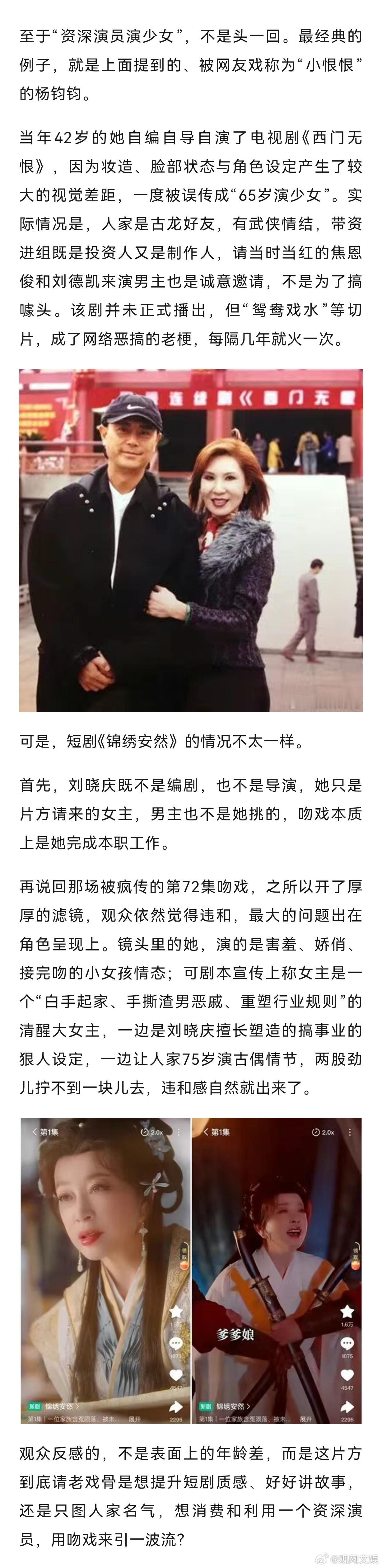 【75岁刘晓庆与小30岁男主拍吻戏,网友吵翻了】老戏骨演短剧是降维打击还是被透支2月26日,75岁知名演员刘晓庆因“再演少女”上了热搜。她在红果平台竖屏短剧《锦绣安然》中饰演绣娘,对看起来同龄的人喊“爹娘”,还和比她小30岁的男演员金珈上演“跨代吻戏”,花絮显示吻戏是编剧连夜加的,不管是“凭什么影视剧‘老男配少女’就是天经地义,轮到女演员就要被苛责和嘲笑?”的争议,还是“演员点赞工伤”事件,事后又证实是配角戏瘾大发不尊重前辈在“蹭热度”,这部剧都已经让网友吵翻了。