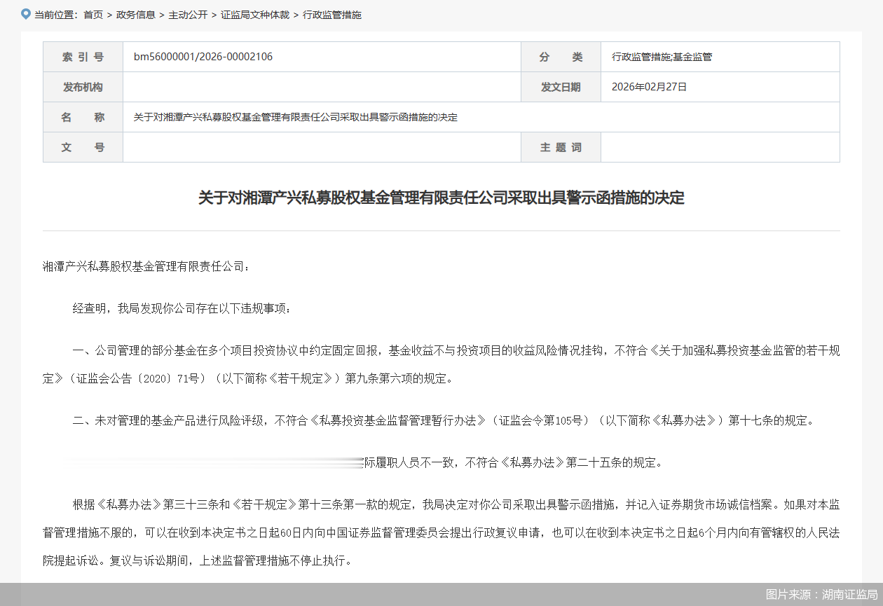 根据有关规定,湖南证监局决定对湘潭产兴私募采取出具警示函措施,并记入证券期货市场诚信档案。