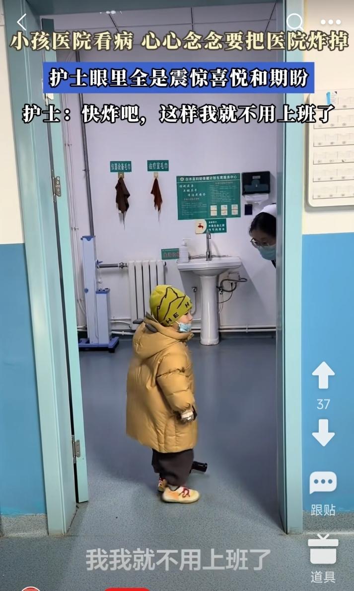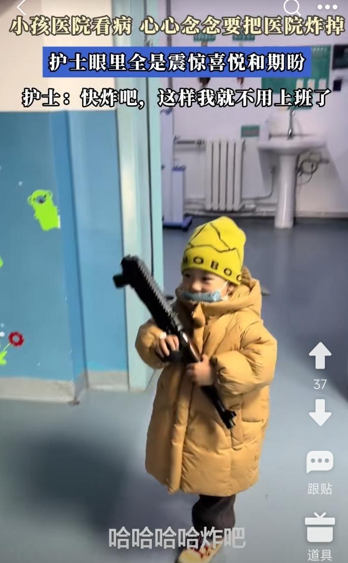 小孩去医院看病,最怕打针。 这不,这还穿着尿不湿的娃娃,因治病被护士扎了两天针。 尿不湿也气不打一处来,病稍好点,就背着枪,拿着手雷跑进护士室奶声奶气的说,要炸了医院。 护士高兴的说,你快炸吧,炸了我们也不用上班了,哈哈。