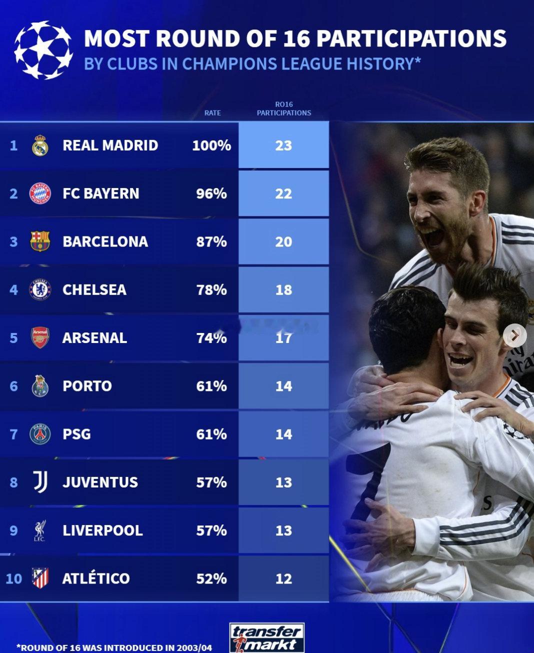皇家马德里以100%的达成率居首;拜仁慕尼黑以22次排名第二;巴塞罗那以20次排名第三。
