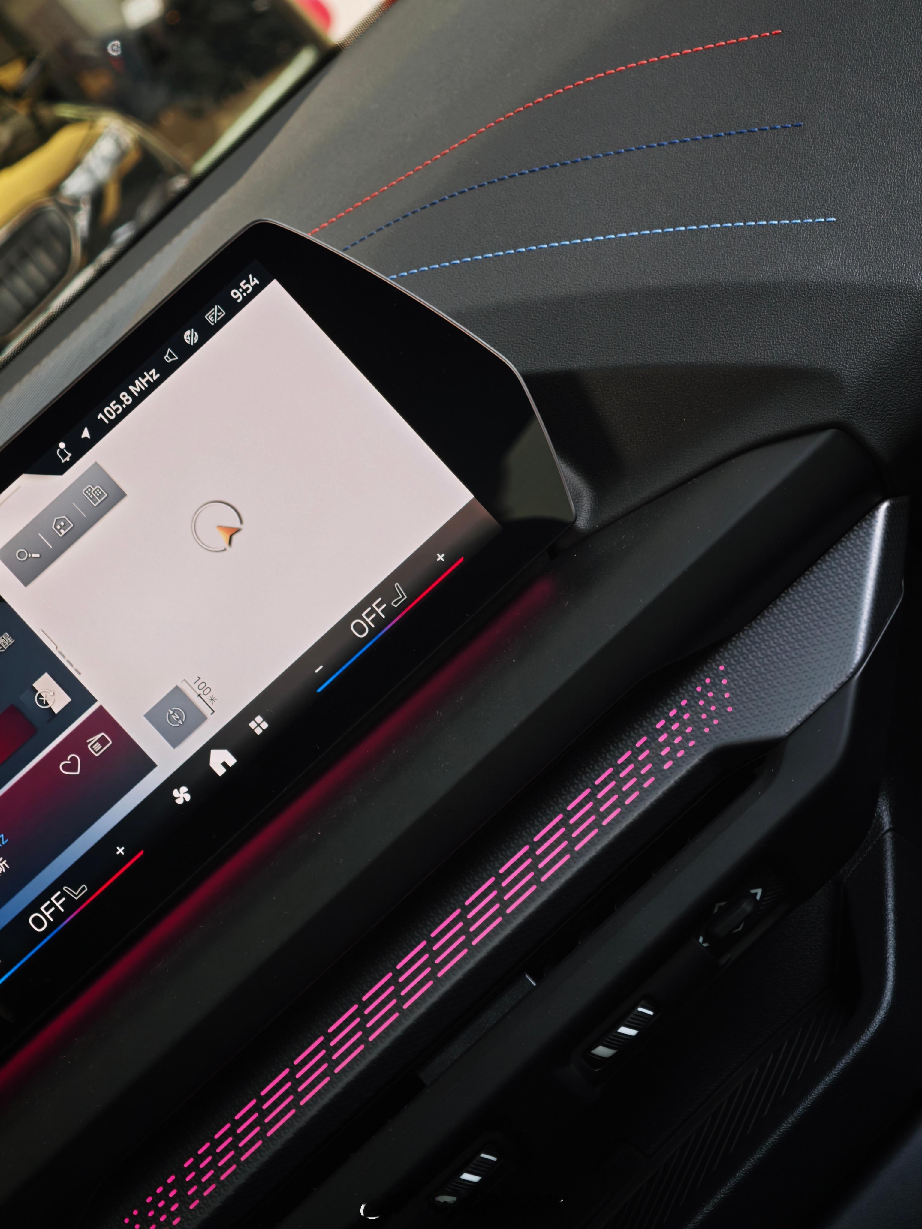 内饰我没太多可说的,和X1系列较为相似,各处的M三色缝线、方向盘回正标、带Alc