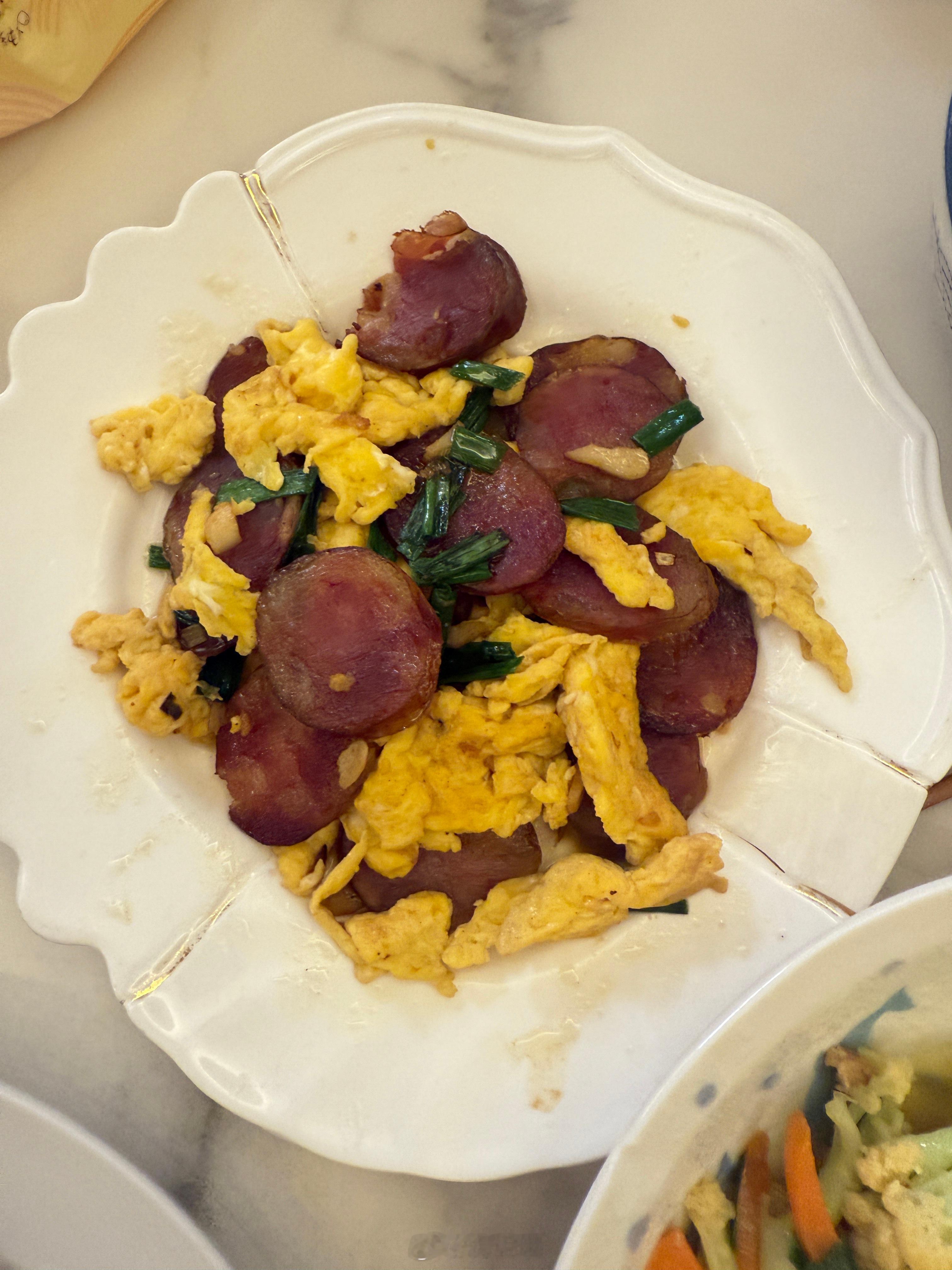 吃饭了东北酸菜煮吊龙,八宝饭,中午剩的香肠炒了个鸡蛋,酸菜煮吊龙是我去广州吃到的