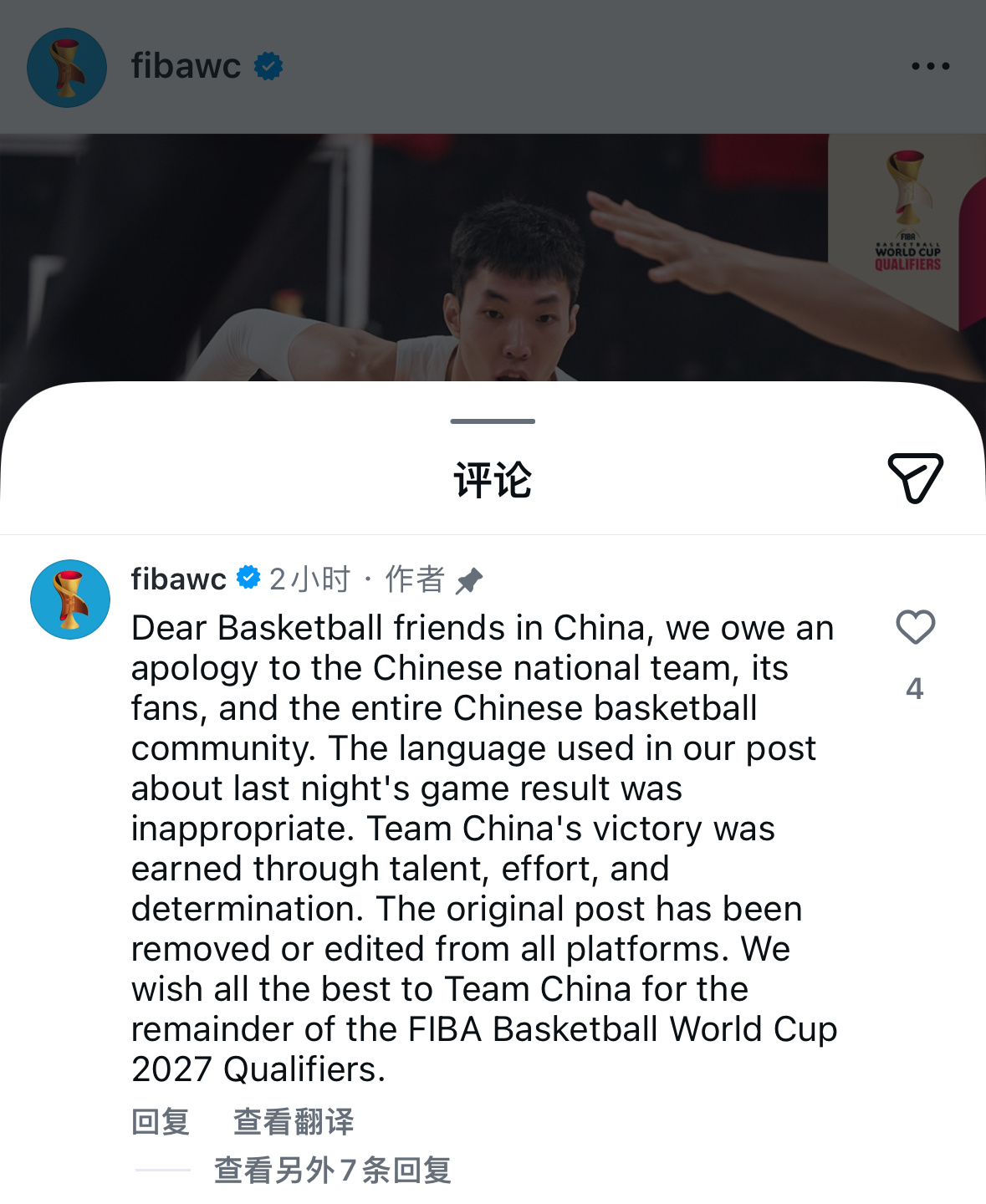 FIBA对昨天外网官博对于中国男篮赢球的不当表述进行道歉,IG是在原贴下面评论进行的道歉,没有单独发布。FIBA国际篮联回应争议文案FIBA国际篮联向中国男篮致歉