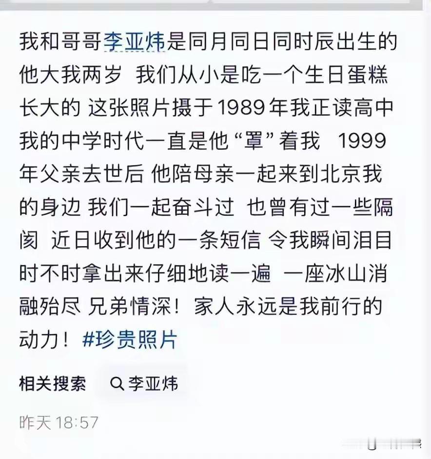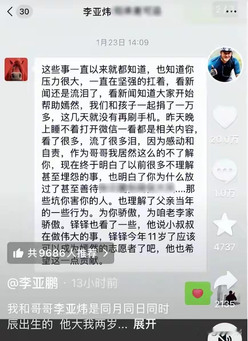 李亚鹏先生公开了哥哥给他发信息的内容,李亚鹏先生的哥哥李亚炜,比李亚鹏先生大两岁,通过他给弟弟发的信息,能够看出来,当年他对弟弟的一些行为也不是很理解,现在他终于理解弟弟了,弟弟的至真至善,让他感到了骄傲,让他感到了自豪,在哥哥发来的信息中,李亚鹏先生给一行字打上了马赛克,这块的内容很重要,应该是两个人的名字,这两个人肯定是坑害了李亚鹏先生,但是李亚鹏先生就放过了他们,足以看出李亚鹏先生的善良!
