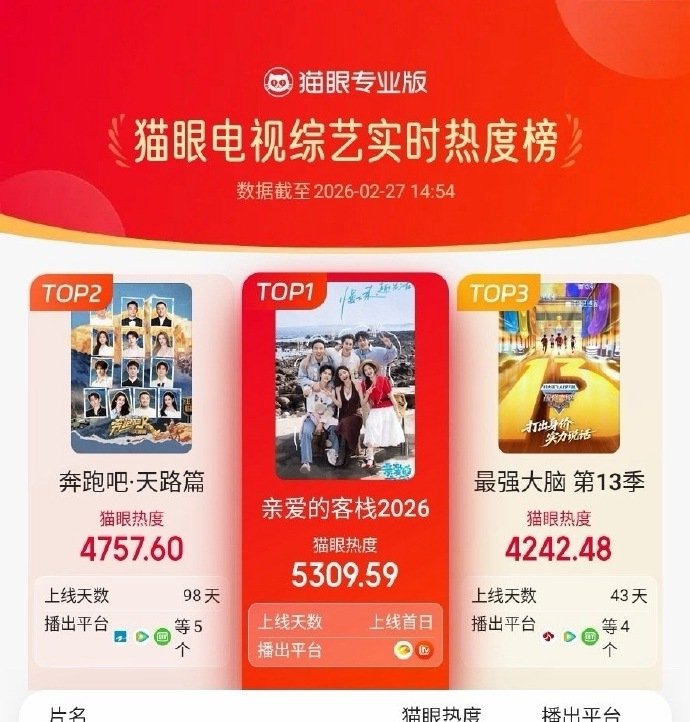 亲爱的客栈4热度亲爱的客栈 首期《亲爱的客栈2026》热度登顶,别错过,一起追综啦!