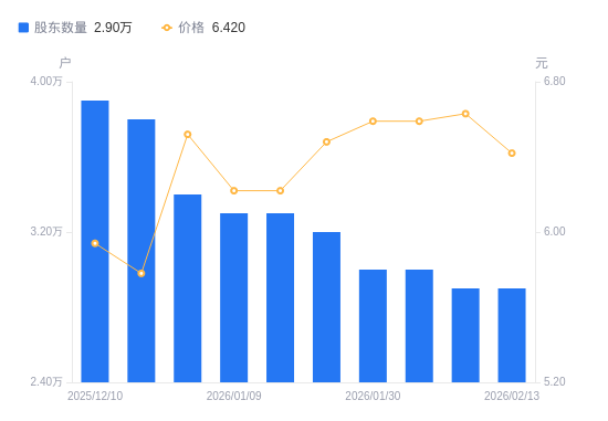 近一年(2025年2月20日至2026年2月13日),大连热电A股股东户数从4.25万户,减低至2.9万户,降幅31.76%,区间股价下跌2.87%。