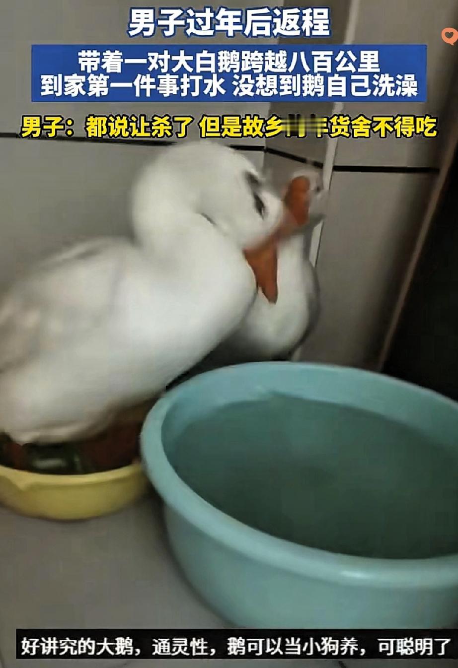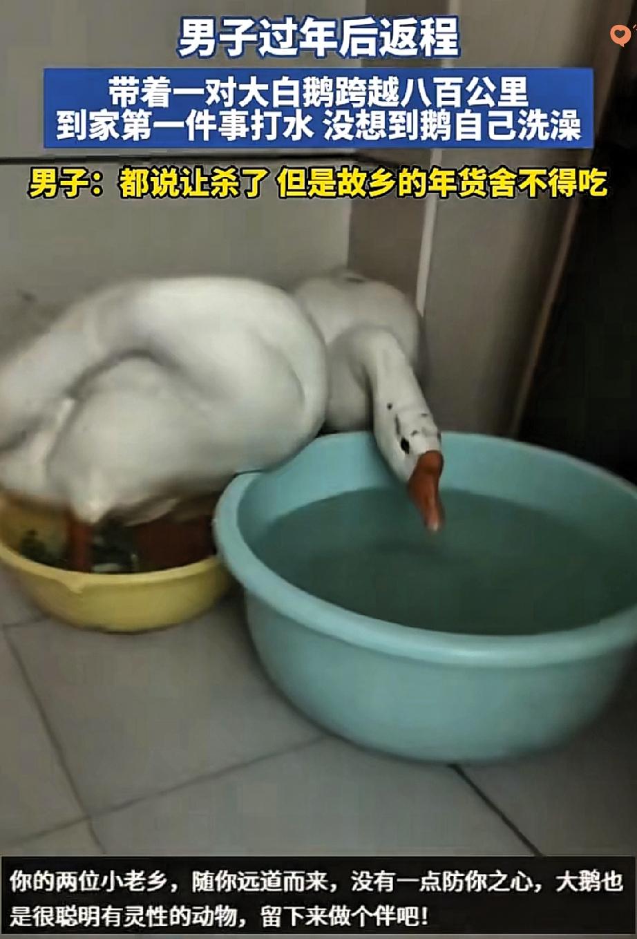 这哪是带了只大鹅,分明是把故乡的牵挂和生命的温柔,跨着八百公里带回了家! 河南大哥春节返程,爸妈硬塞给他自家养的大鹅,满心盼着他回去补补。 从河南到山东,一路颠簸,大哥到家第一件事就给大鹅打了水,没想到这小家伙一点不生分,自己扑棱着翅膀洗起了澡,那股子自在劲儿,瞬间戳中了他。 本来是奔着“吃”去的,可看着这有灵性的模样,再想到爸妈喂养时的身影,大哥实在下不去手。 这大鹅哪里只是年货,是父母怕他在外吃不好的惦记,是故乡泥土里长出来的念想,更是跨越物种的温柔救赎。 人间最暖的,从来不是山珍海味,而是这份“不忍心”里藏着的善良。 你有没有过因为某个瞬间,放弃了原本的想法,守住了一份温柔?评论区聊聊~