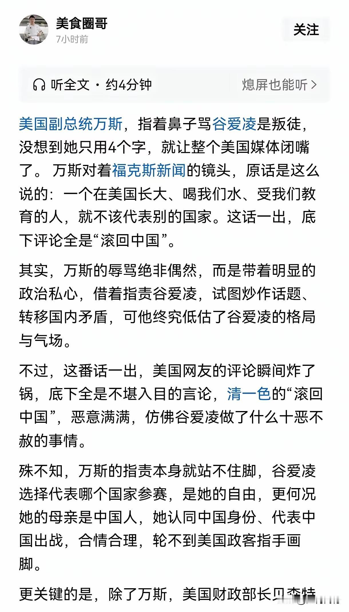 谷爱凌让美国人红眼了,不仅红眼了,也急眼了,从他们的副总统,到他们的财长,再到他们的议员,再到他们的普通个别老百姓,现在都在批评谷爱凌,用政治的手段来攻击一个运动员,醉翁之意不在酒,只说明他们真的害怕了,他们感觉他们的风头被盖住了,他们感觉他们的吸引力降低了,他们感觉到他们的软实力不行了,同时也暴露了他们的狭隘之心!