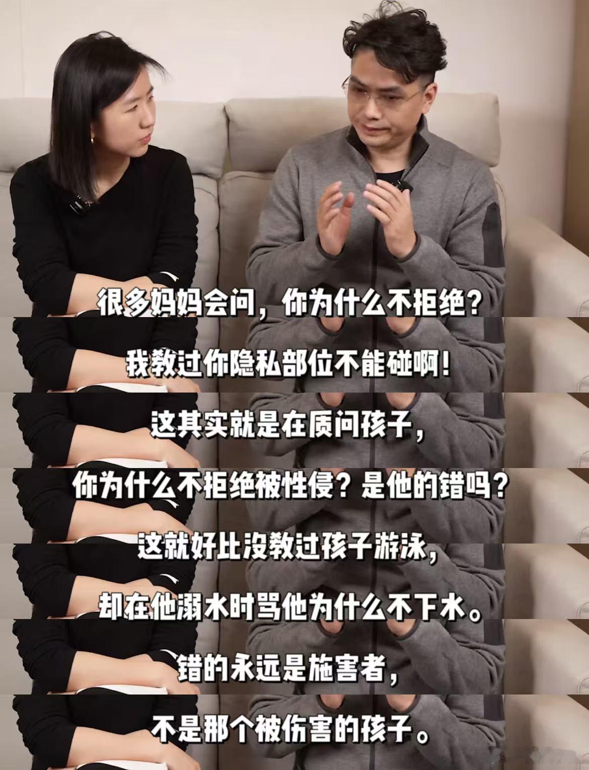 男孩被侵犯4年以为是游戏 我们总站在上帝视角说“为什么不早点教孩子”,可看完这期访谈我才发现,很多家长不是不教,是不知道怎么教。 安全官爸爸说他这些年收到了近10万条关于被侵犯的咨询。其中超过90%的妈妈都会说一句话:我非常认真地在孩子小的时候就反复提醒过,身体的隐私部位不可以让别人碰。 但那个幼儿园的测试证明,99%的孩子会在话术下脱衣服。不是妈妈教得不对,是坏人太会编理由。 很多妈妈教孩子的时候,只是简单地说“不可以”。但坏人会问“为什么不可以”。孩子回答不出来,坏人就会说“那是因为你不懂,其实是可以的”。所以孩子需要的不是“不可以”,是需要知道“为什么不可以”以及“如果有人这样做怎么办”。 只教一半,等于没教。 我回想自己是怎么教女儿的,好像也只是说“不可以”。今天回去我要重新教,要告诉她“如果有人让你脱衣服,不管他说什么,都要先问妈妈”。