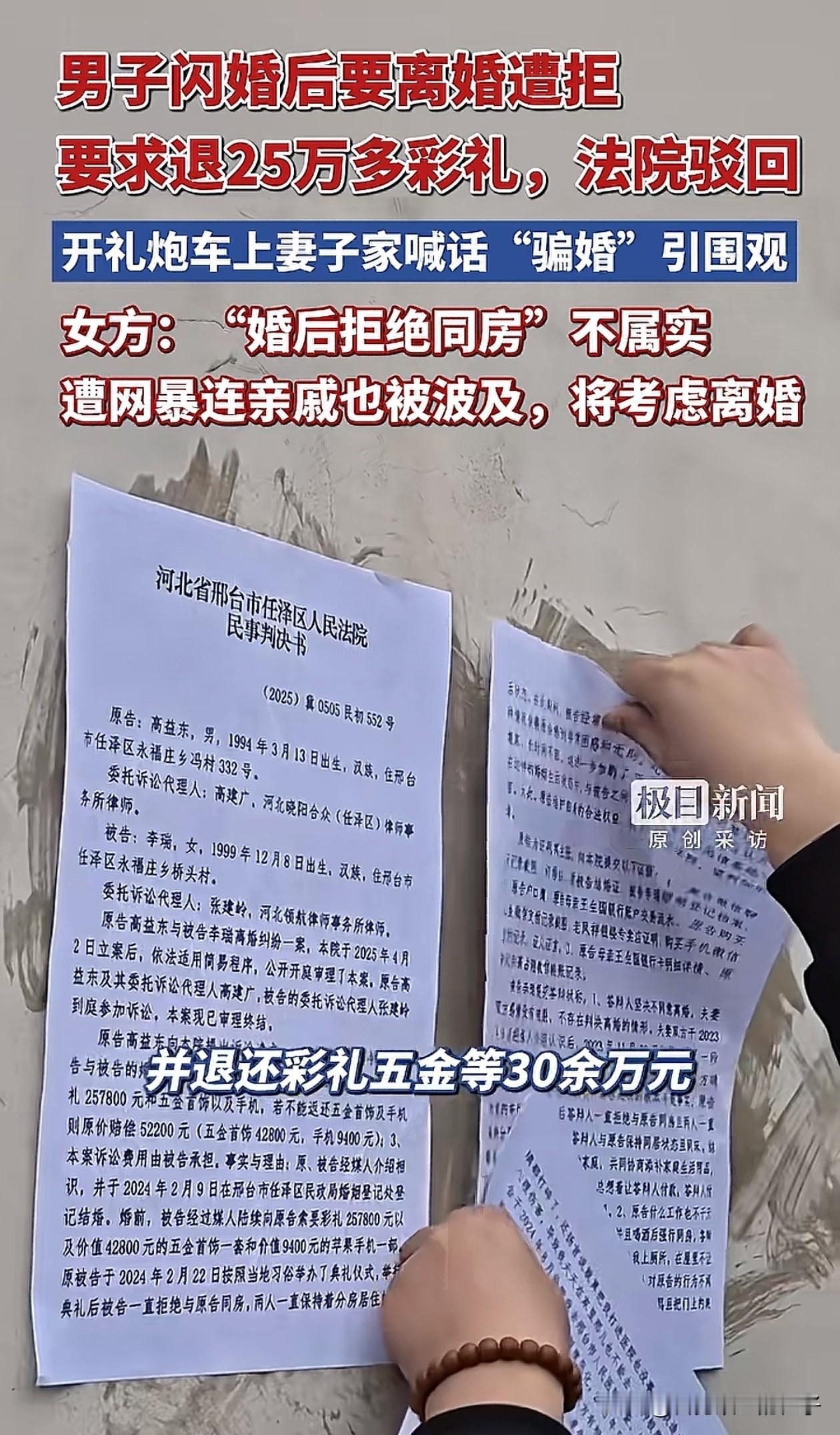 河北邢台桥头村这场离婚闹剧,我有一个疑惑想不明白,男女双方都分居这么长时间了,女的又不愿同房,男方为什么还会起诉离婚失败? 法院一审判决不准离婚,因为男方提交的证据,不足以证明双方感情破裂,且女方不同意离婚,还称愿意修复婚关系。 据知情网友说,两人是相亲认识的,小伙还是个退伍军人,女子是二婚,相识10多天就仓促的把婚礼办了,但婚后,两人基本一起生活,女方拿到彩礼就回娘家了,别说同房,连牵一下手都不行。 为了拿回彩礼,现在男方只能到女方家门口去讨要说法,双方拿着喇叭在村里争执不休,引得众人围观! 男方家属说女子不履行夫妻义务,女方则辩解她有抑郁症,男方逼迫她在生理期同房,指责男方态度不好,目前当地政府已经介入调解! 都闹上热搜了,这种婚姻关系还有修复的必要吗,直接离婚不就好了,让女方把彩礼退回去,大家怎么看呢?