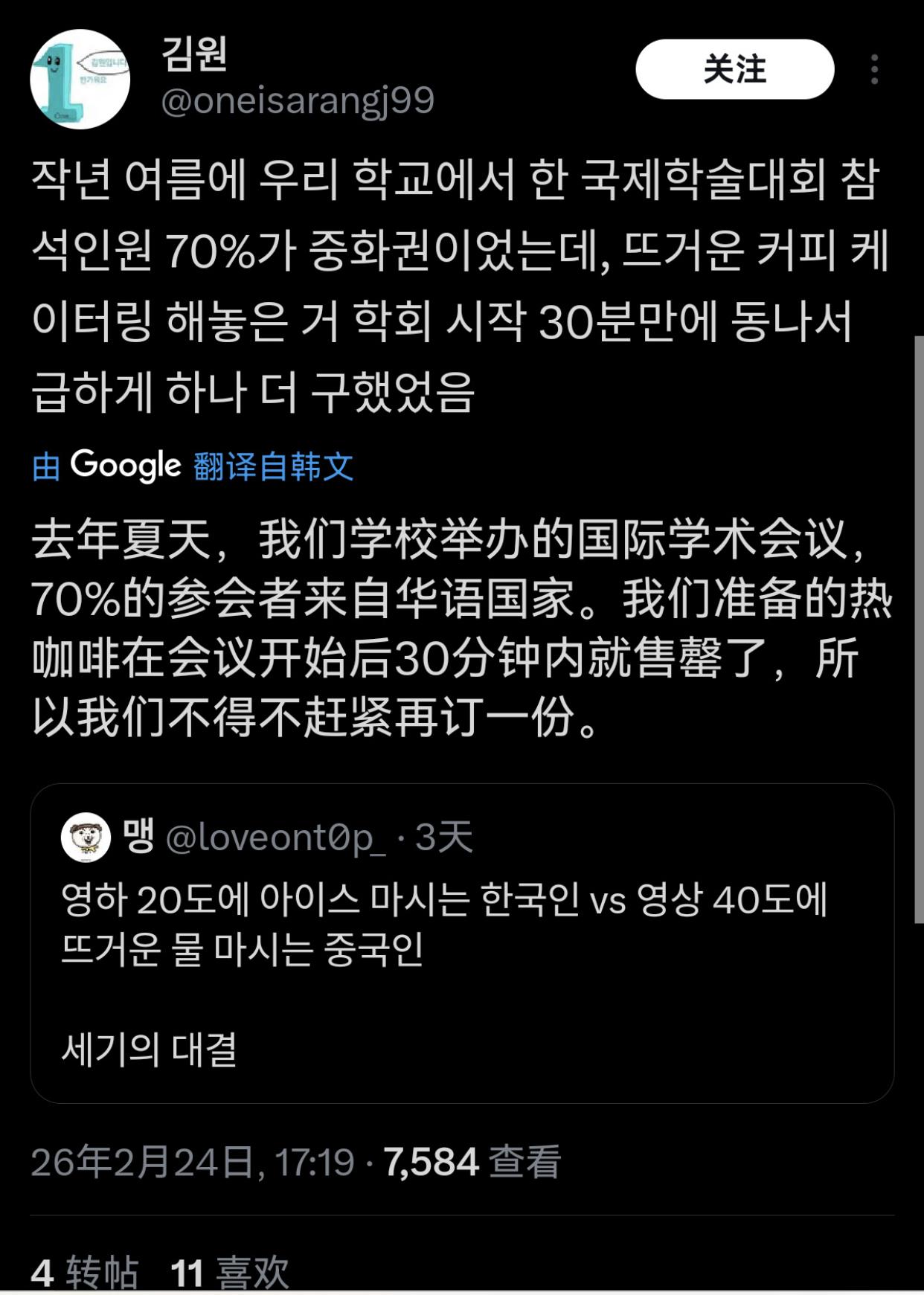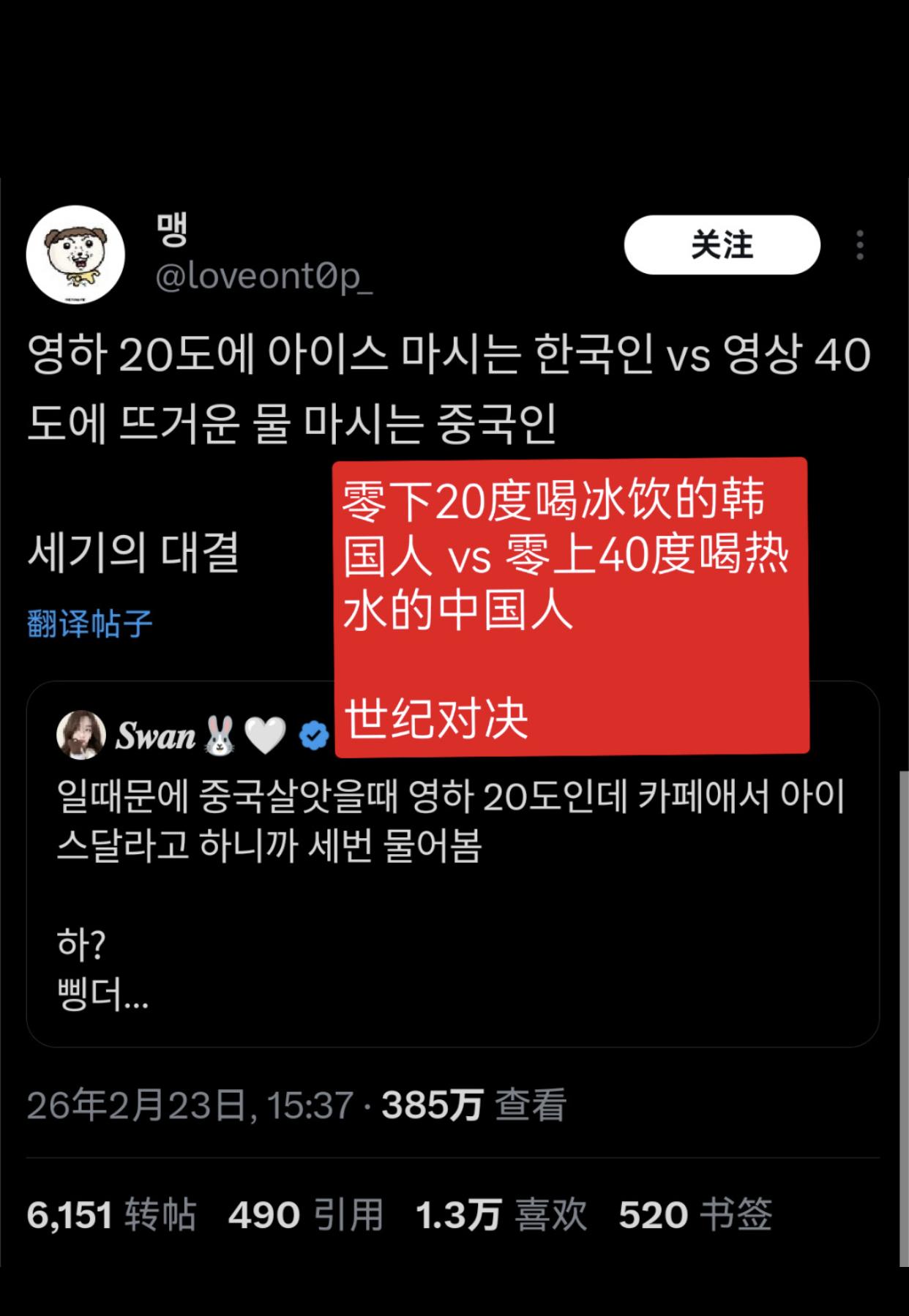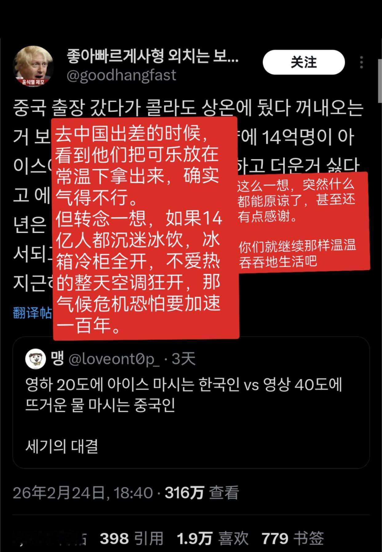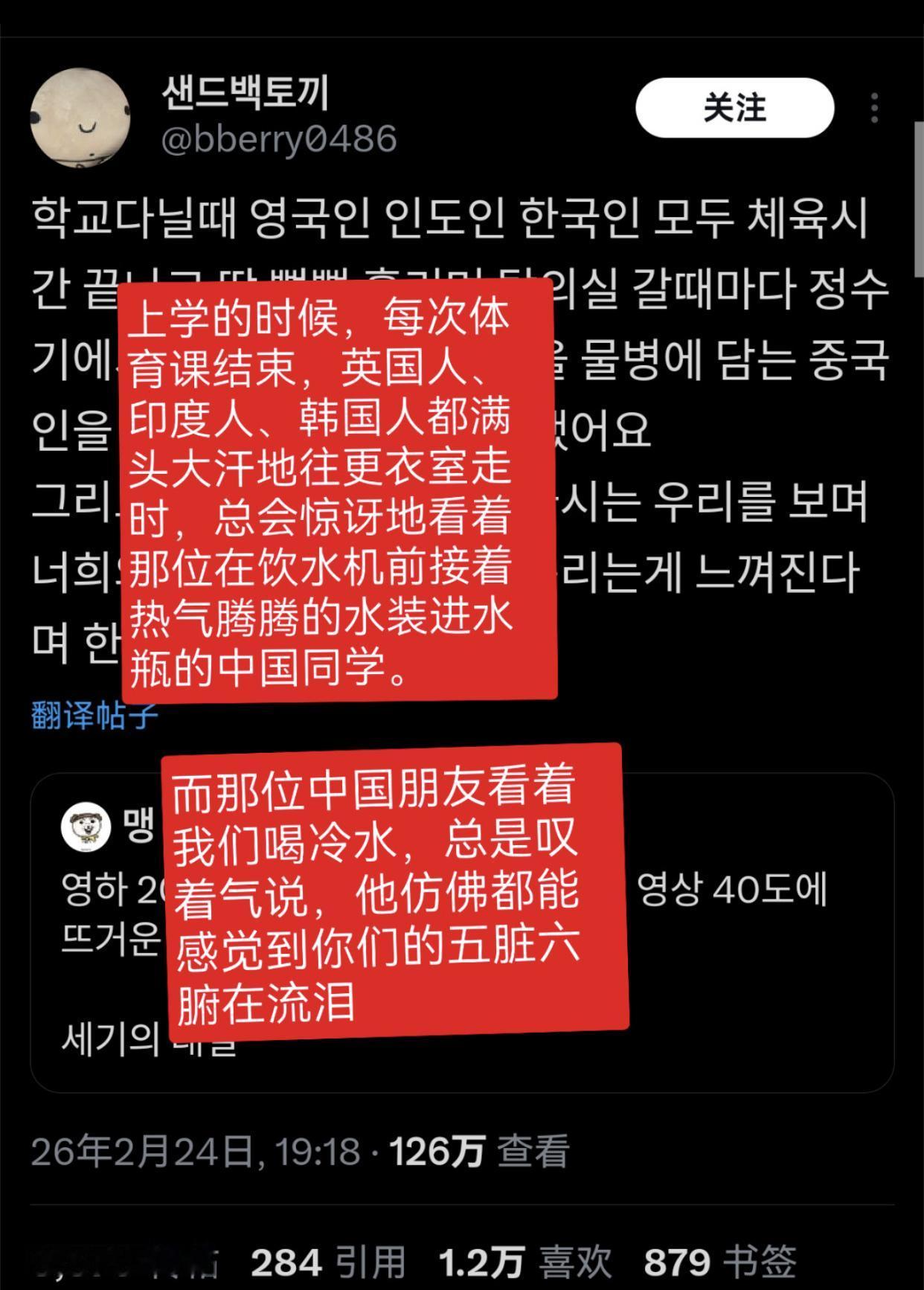 韩国人讨论称无法理解中国人爱喝热水的现象,并觉得韩国人自己喝冷饮蛮有优越感的: “在中国工作的时候,零下20度在咖啡店点冰饮,结果被问了三次确定是否真的要喝冰的。” “零下20度喝饮料的韩国人和零上40度喝热水的中国人的世纪对决。” “去上海玩,点了一瓶可乐,端上来的是温的,我就说‘Oh no,cold cold!’对方才发现是韩国人,飞快的换了一瓶冰的。” “上学时,每次体育课结束,英国人、印度人、韩国人都满头大汗的往更衣室走时,总会惊讶地看着那位在饮水机前接着热水装进水瓶的中国同学。” “去年夏天,我们学校举办的国际学术会议,有70%的参会者来自华语国家,我们准备的热咖啡在会议开始后30分钟内就售罄了,所以我们不得不赶紧再订一份。” “去中国出差,看到他们把可乐放在常温下拿出来,确实气得不行,但转念一想,如果14亿人都沉迷冰饮,冰箱冷柜全开,不爱热的整天空调狂开,那气候危机恐怕要加速一百年。” “如果中国和印度都不使用空调那或许是个好主意。” “在中国要冰块的时候,他们端来一个大到十个人分都还够剩下的碗,结果我和朋友们笑得不行。”