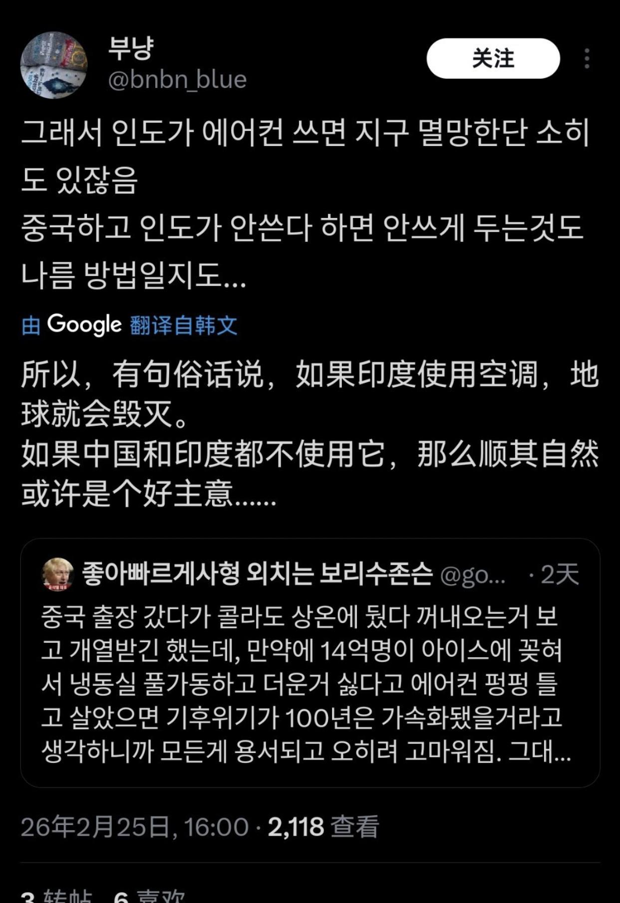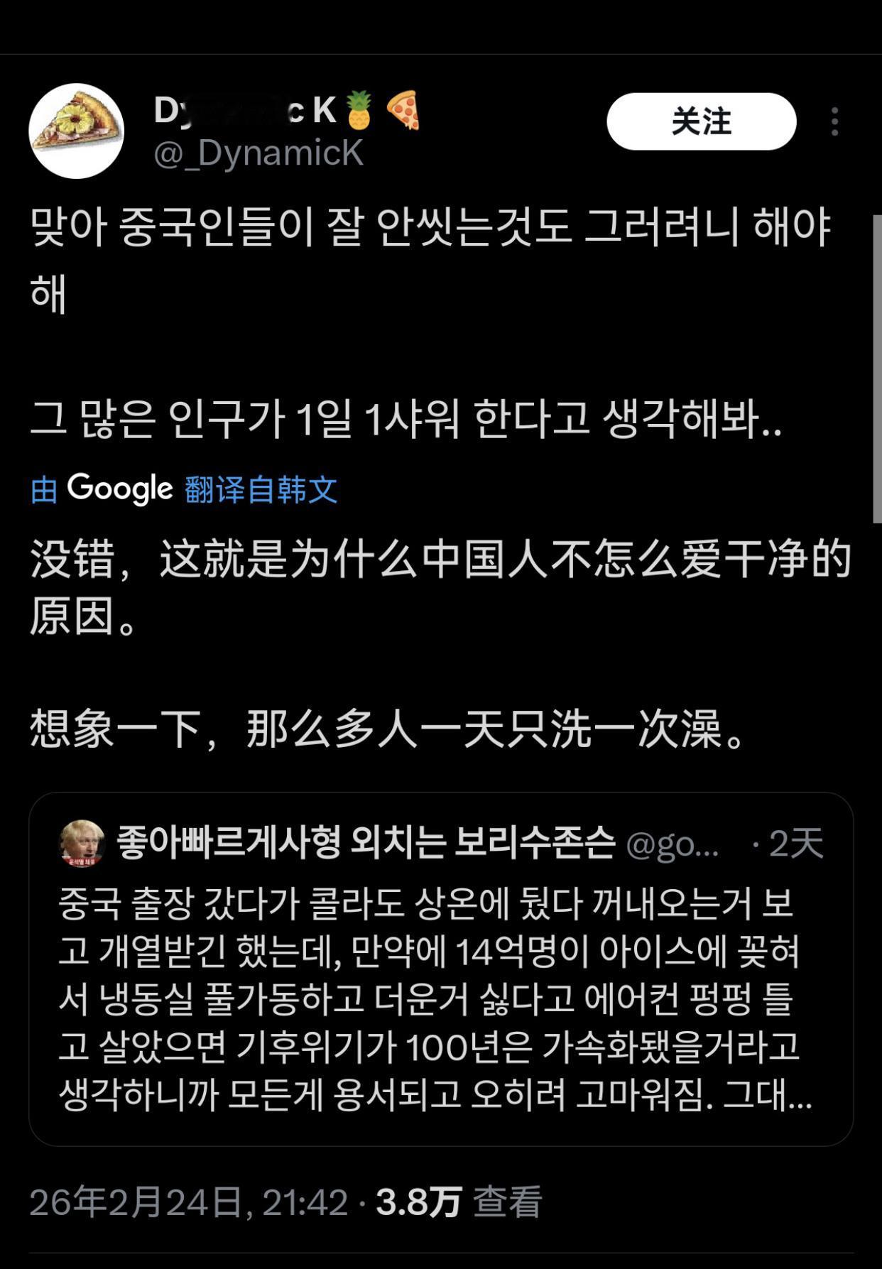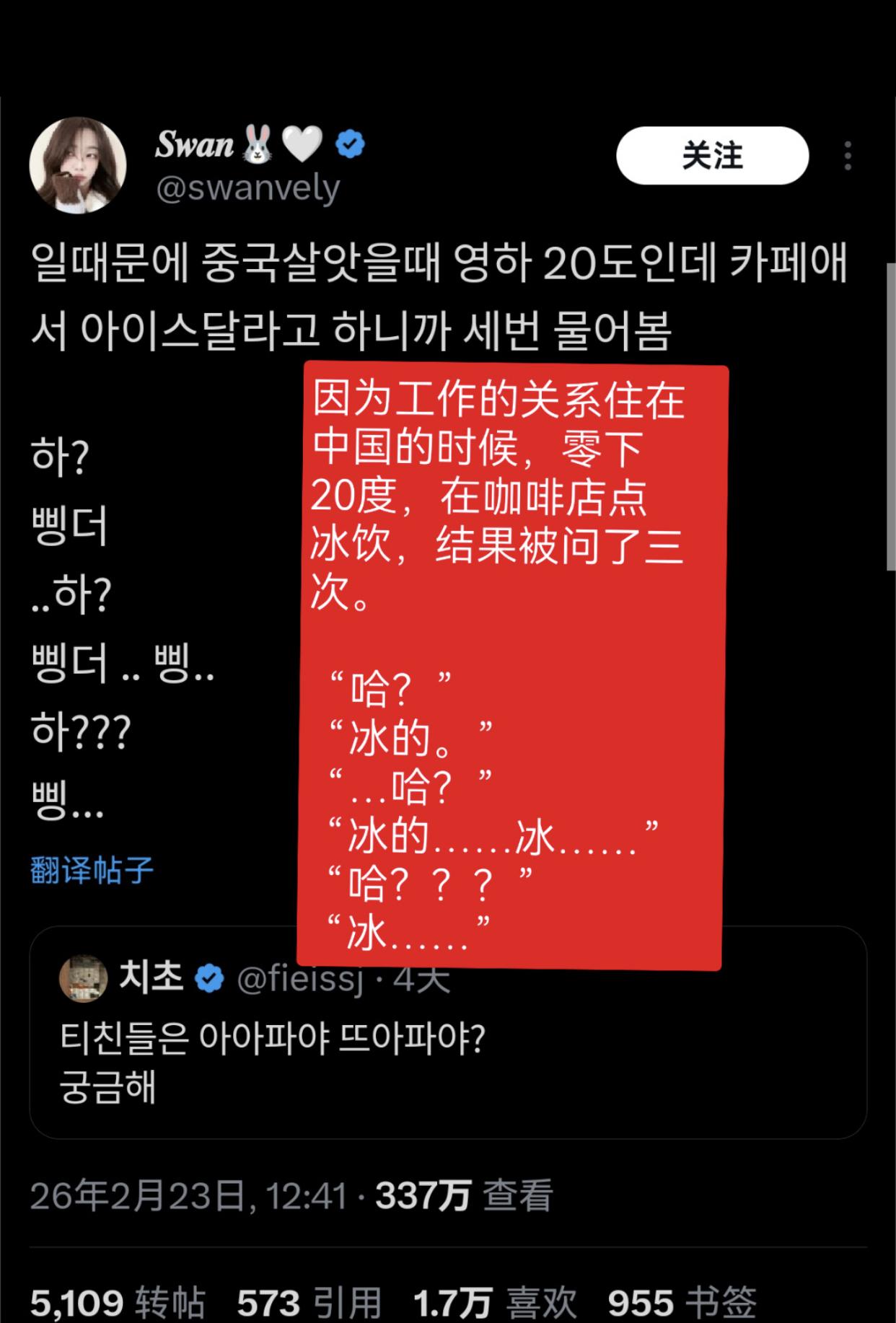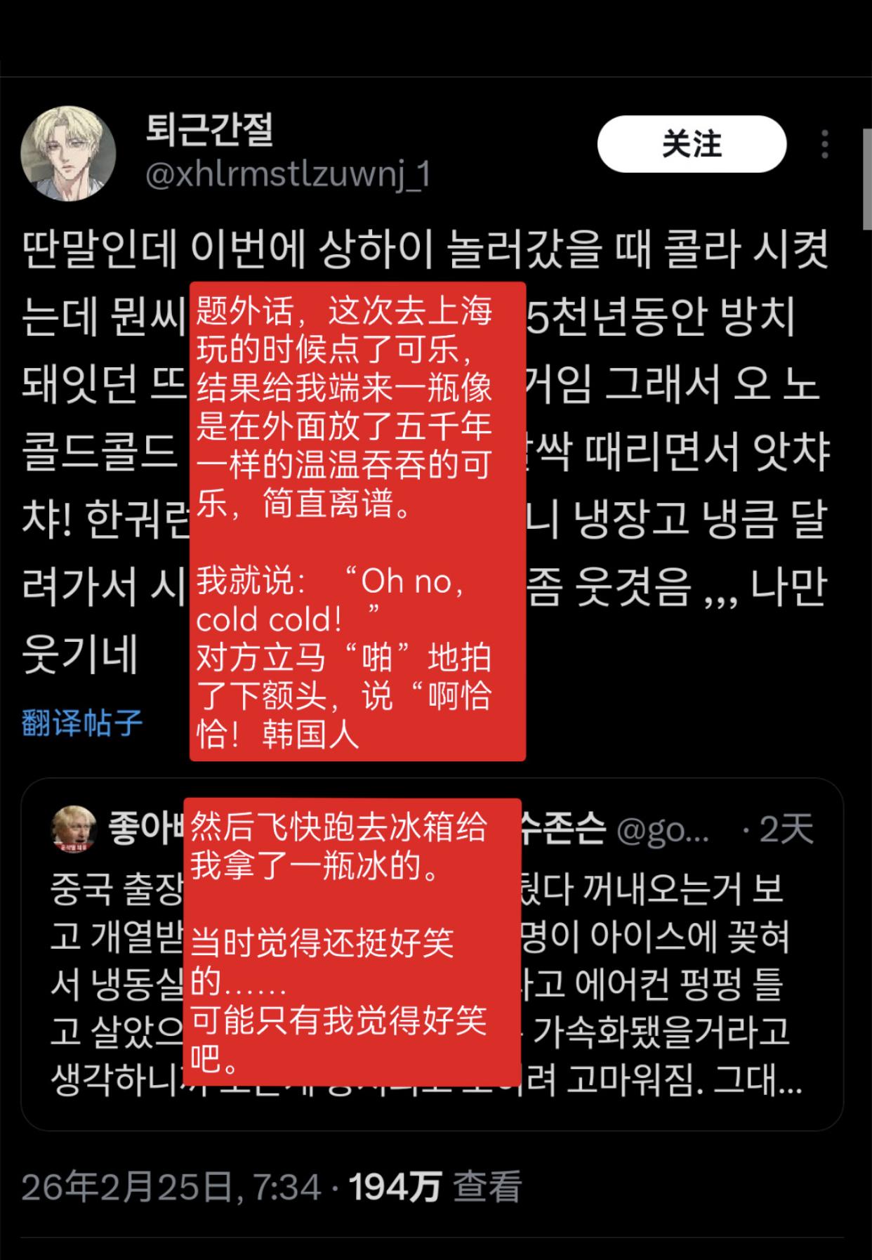韩国人讨论称无法理解中国人爱喝热水的现象,并觉得韩国人自己喝冷饮蛮有优越感的: “在中国工作的时候,零下20度在咖啡店点冰饮,结果被问了三次确定是否真的要喝冰的。” “零下20度喝饮料的韩国人和零上40度喝热水的中国人的世纪对决。” “去上海玩,点了一瓶可乐,端上来的是温的,我就说‘Oh no,cold cold!’对方才发现是韩国人,飞快的换了一瓶冰的。” “上学时,每次体育课结束,英国人、印度人、韩国人都满头大汗的往更衣室走时,总会惊讶地看着那位在饮水机前接着热水装进水瓶的中国同学。” “去年夏天,我们学校举办的国际学术会议,有70%的参会者来自华语国家,我们准备的热咖啡在会议开始后30分钟内就售罄了,所以我们不得不赶紧再订一份。” “去中国出差,看到他们把可乐放在常温下拿出来,确实气得不行,但转念一想,如果14亿人都沉迷冰饮,冰箱冷柜全开,不爱热的整天空调狂开,那气候危机恐怕要加速一百年。” “如果中国和印度都不使用空调那或许是个好主意。” “在中国要冰块的时候,他们端来一个大到十个人分都还够剩下的碗,结果我和朋友们笑得不行。”
