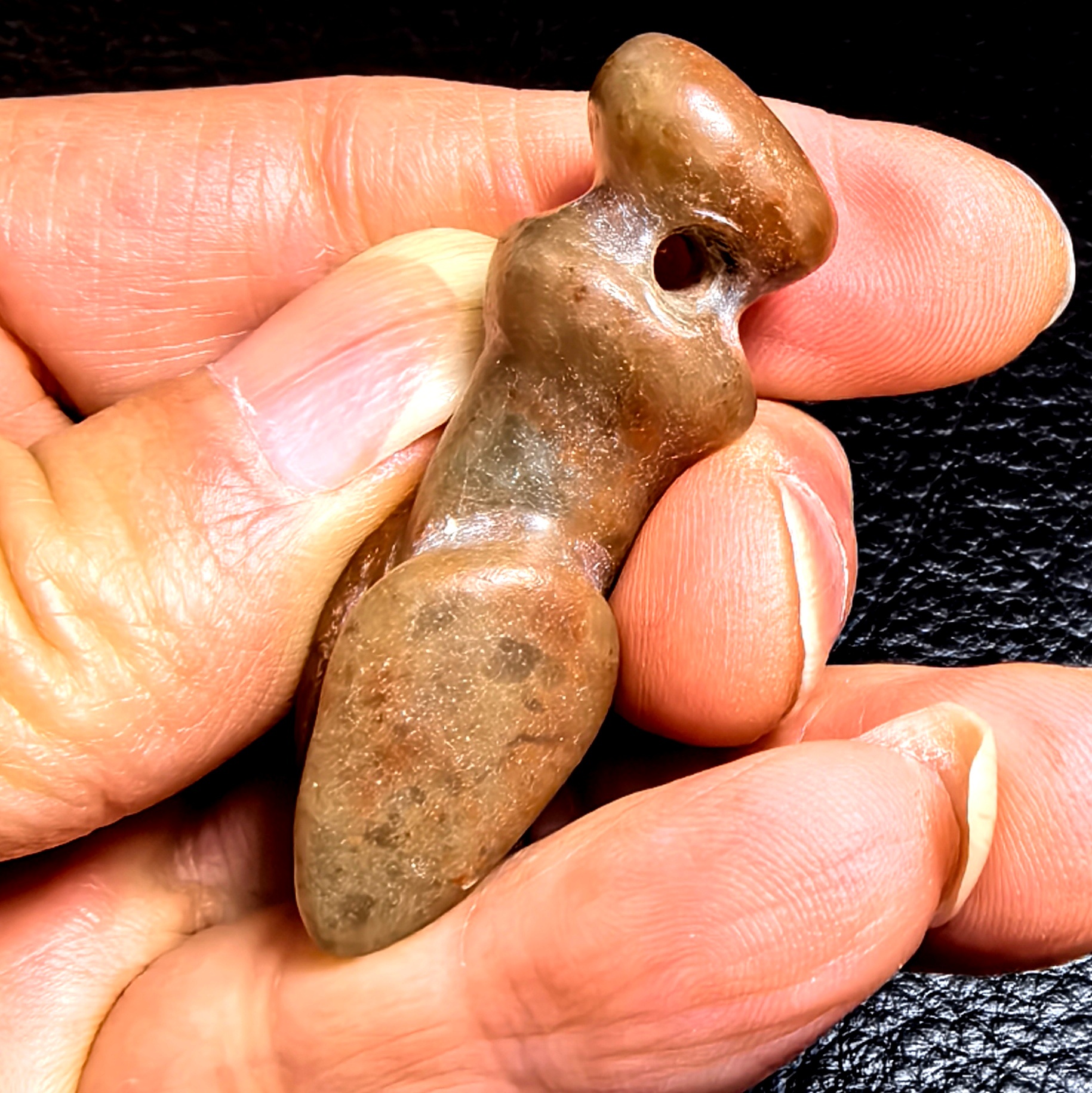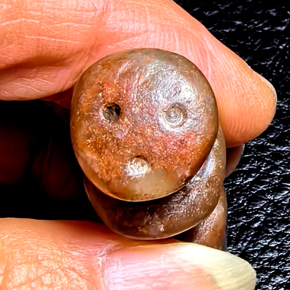 高古玉 红玉器小精品,估计在市面上几乎独一无二,脸部简单简扼要,三个孔,双手拱形