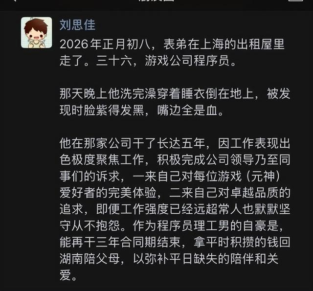 据凤凰网财经此前报道,一名36岁程序员在春节复工当晚于上海出租屋内被发现死亡。自称为其亲属的发帖者称,该员工于正月初八上班后当晚离世,公司目前提出3万元补贴及意外险处理。