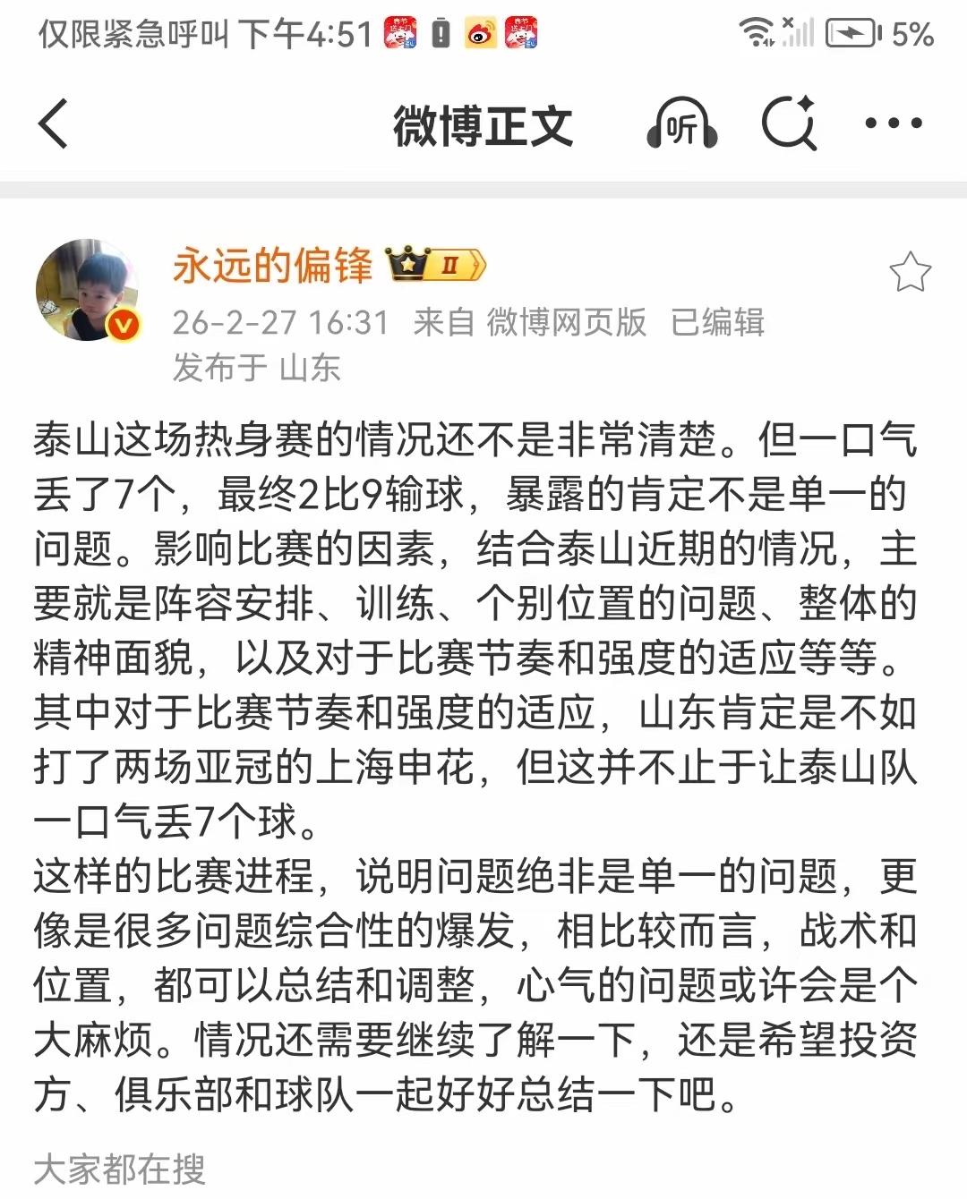 山东泰山队热身赛2:9惨败上海申花! 一些媒体人又站出来开喷了! 一场热身赛而已,有必要上纲上线吗! 你们就知道拿泰山队说事,来蹭流量!