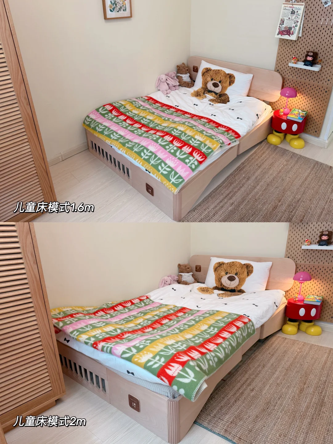 为了留出足够的活动空间,给她选择了宽1.2m的可翻转儿童床,最让我心动的就是它的两种床体都可伸缩40cm
